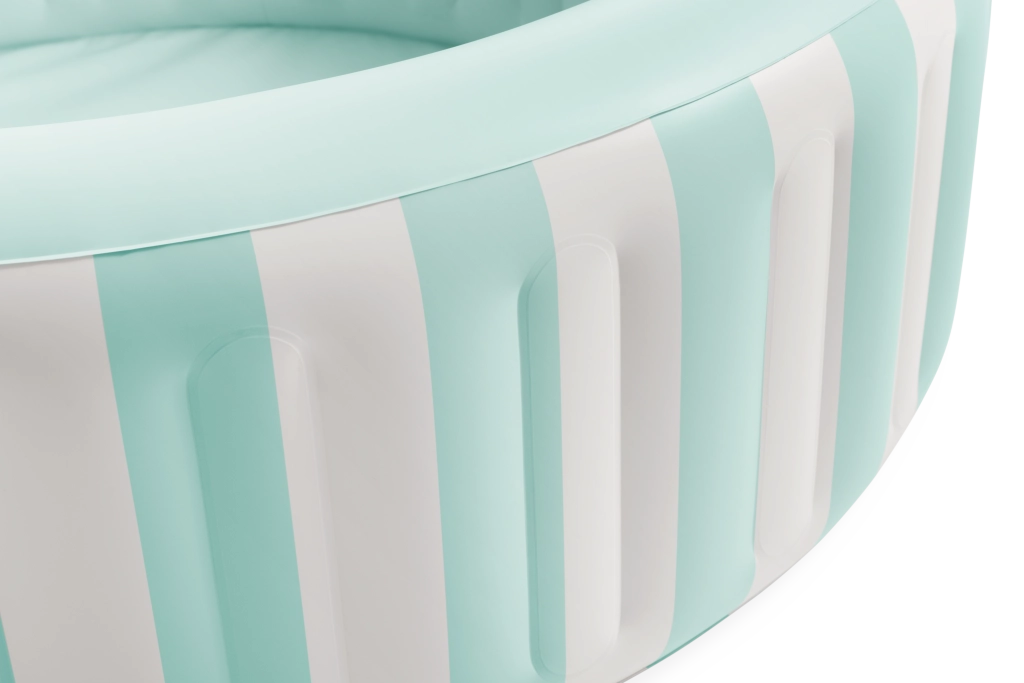Het opblaasbare Coastal Luxe zwembad in modern maritiem design is ideaal voor zomerse waterspelletjes van jongere kinderen. Verticale strepen in licht turquoise en wit zorgen voor een frisse look, terwijl het gladde binnenoppervlak in zacht turquoise een gevoel van netheid en rust oproept. Duurzaam PVC en meer-kamerige wanden bieden stabiliteit en comfort bij zitten en spelen.