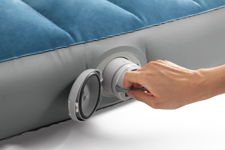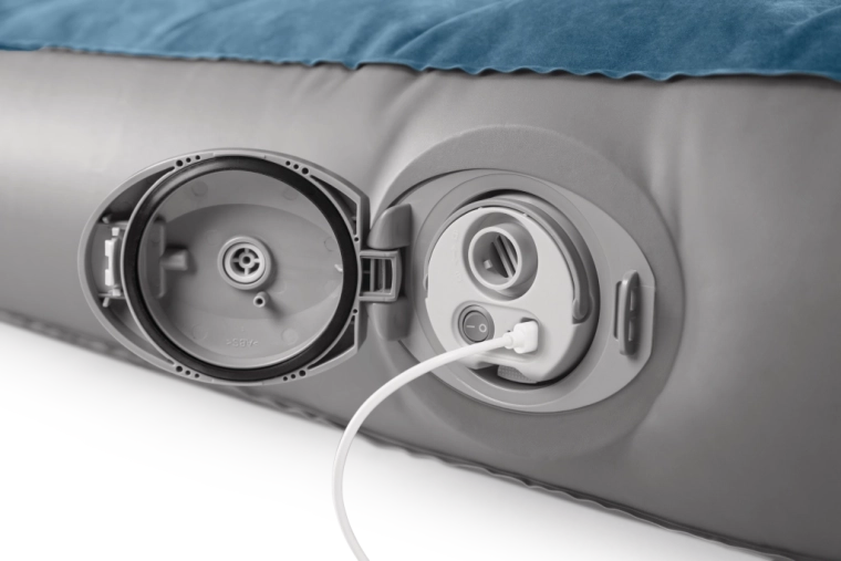 De geïntegreerde oplaadbare pomp met Li‑ion‑accu schuift rechtstreeks in de opening aan de zijkant van het bed en zorgt voor snel opblazen en leeg laten lopen. Opladen via USB duurt ongeveer 3 uur, de pomp heeft automatische uitschakeling na 8 minuten en dankzij twee opzetstukken kun je hem ook gebruiken voor andere opblaasproducten. Is de accu leeg, dan kun je het bed eenvoudig bijpompen via het 2‑in‑1‑ventiel.