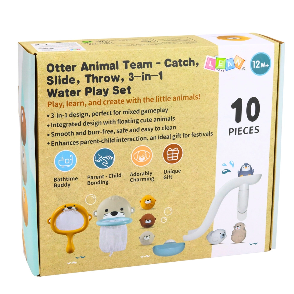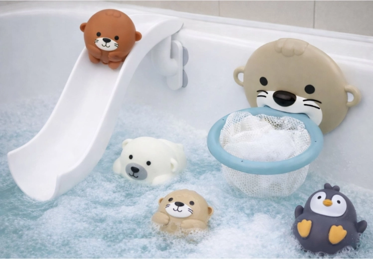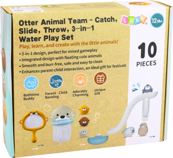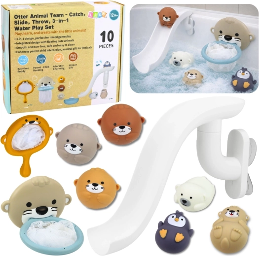 Maak van badtijd een feestje! Deze speelse badset met glijbaan, net en schattige diertjes biedt creatieve waterspelletjes, stimuleert de fijne motoriek en de oog-handcoördinatie. Onderdelen bevestig je eenvoudig met zuignappen, de diertjes drijven en glijden over de baan, en het net helpt bij het vissen van speelgoed en opruimen na het bad.