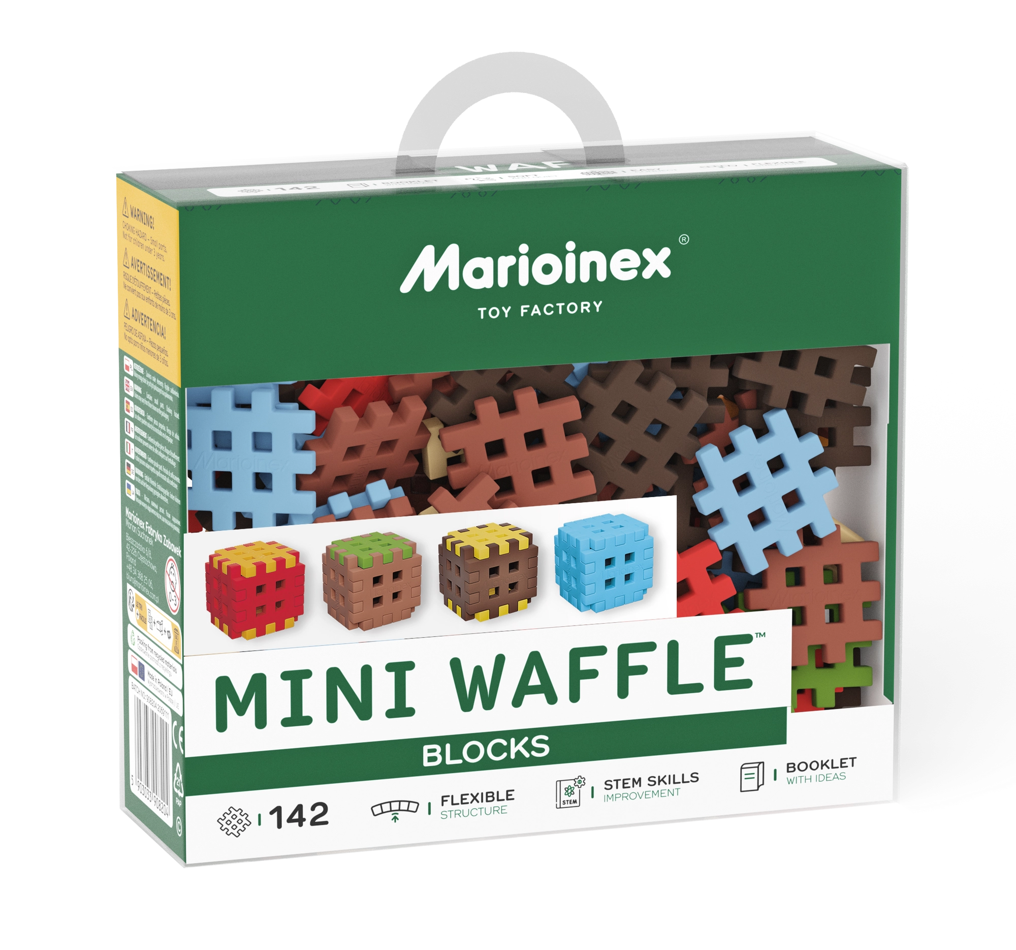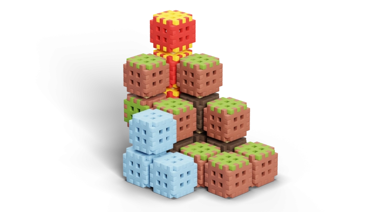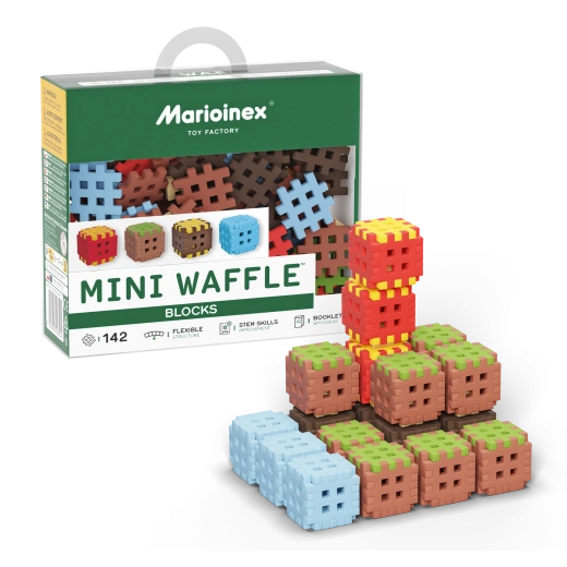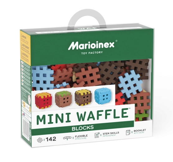 De Mini Waffle Blocks-bouwset bevat 142 kleurrijke onderdelen geïnspireerd door de natuur – bruine “aarde”, groen “gras”, ijsblauwe elementen en energieke rood-gele accenten. Dankzij het zachte en flexibele materiaal liggen de blokken prettig in de hand en klikken ze ook voor jongere kinderen makkelijk in elkaar.