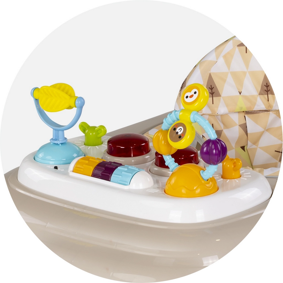 Het interactieve paneel met kleurrijk speelgoed, knoppen, lichteffecten en 12 melodieën stimuleert fijne motoriek, zintuiglijke waarneming en coördinatie. Het paneel is afneembaar, zodat je kind ook los van het loopstoeltje kan spelen. De constructie is eenvoudig opvouwbaar voor ruimtebesparing en handig meenemen.