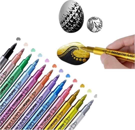 Deze veelzijdige set metallic markers is ideaal voor scrapbooking, kalligrafie, het maken van kaarten, het decoreren van stenen, glas of keramiek. Dankzij de nylon punt, zacht en flexibel schrijf je soepel en precies – van fijne details tot het inkleuren van grotere vlakken.