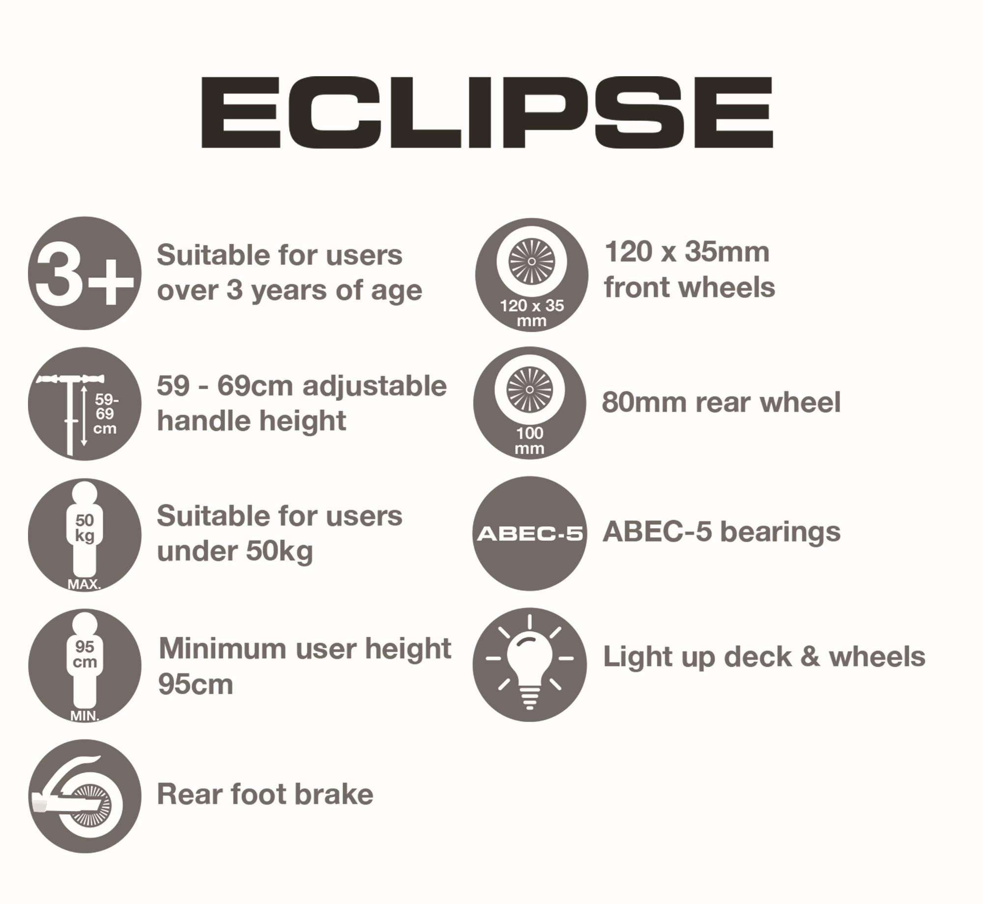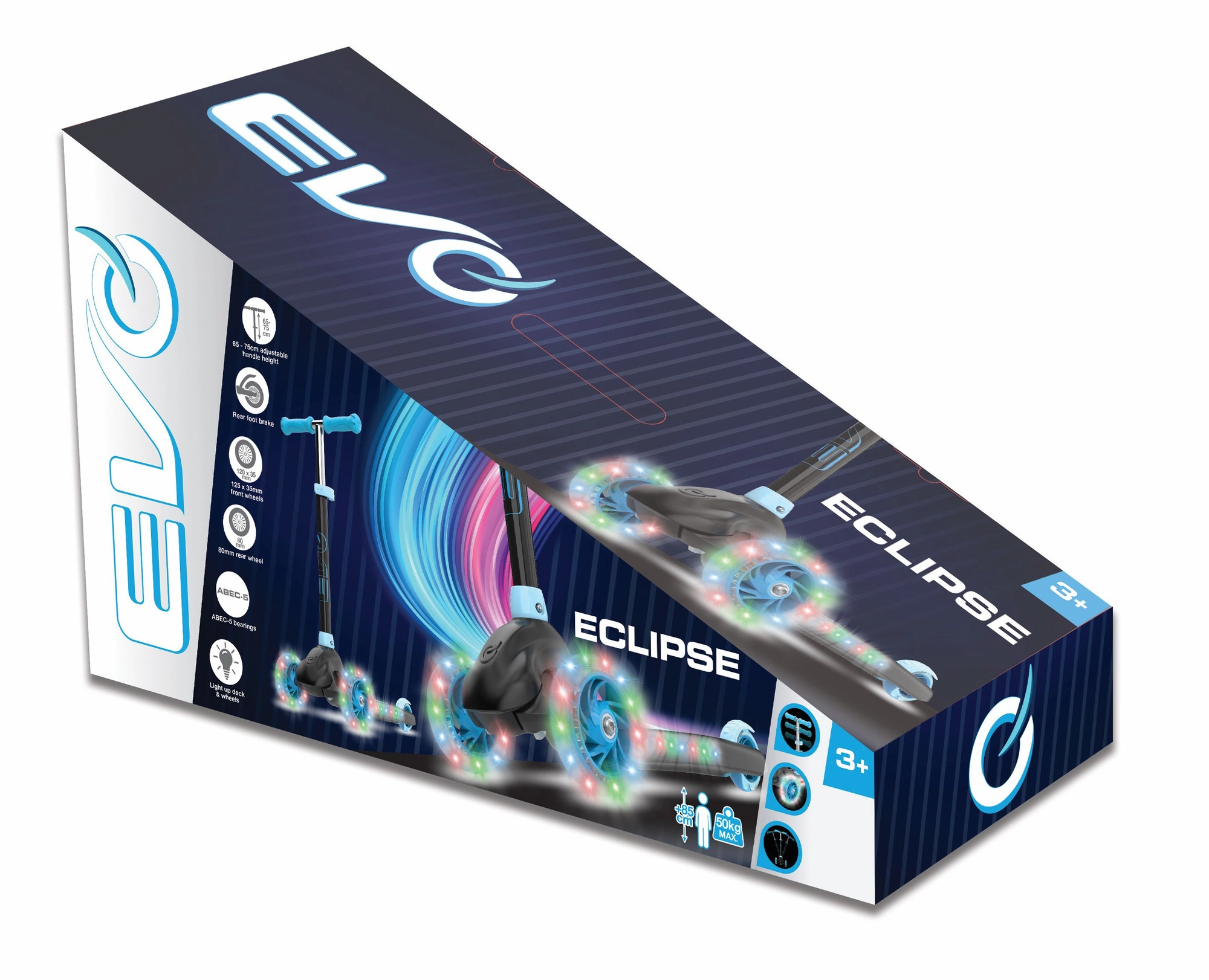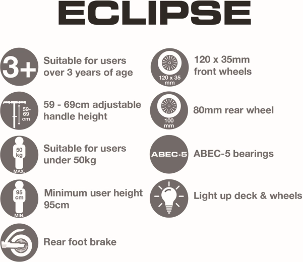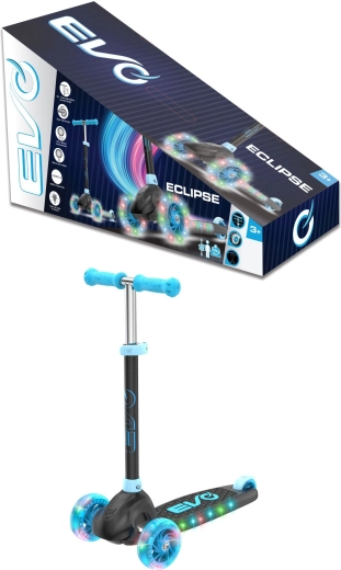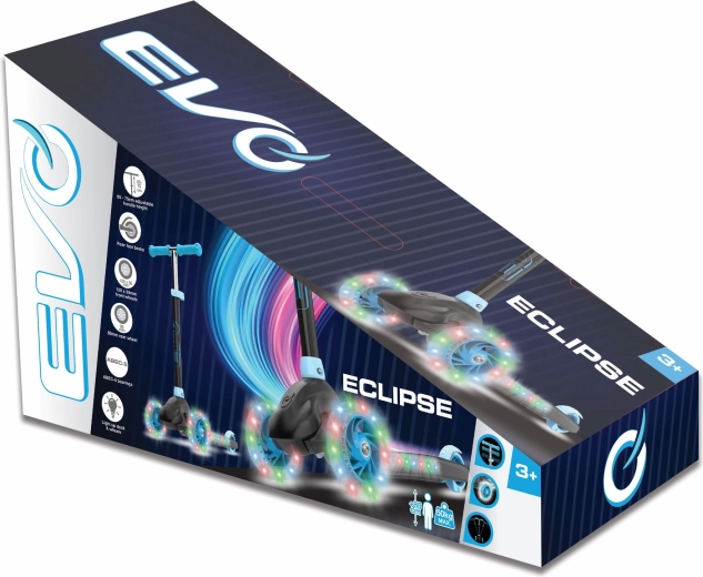 De EVO Eclipse step is ontworpen voor de eerste stappen in de wereld van het steppen – drie wielen bieden hoge stabiliteit, terwijl de lichte constructie en de voetrem boven het achterwiel zekerheid geven bij het stoppen. LED-verlichting in de wielen en het deck verandert elke rit in een leuke lichtshow en verbetert de zichtbaarheid in de schemering.