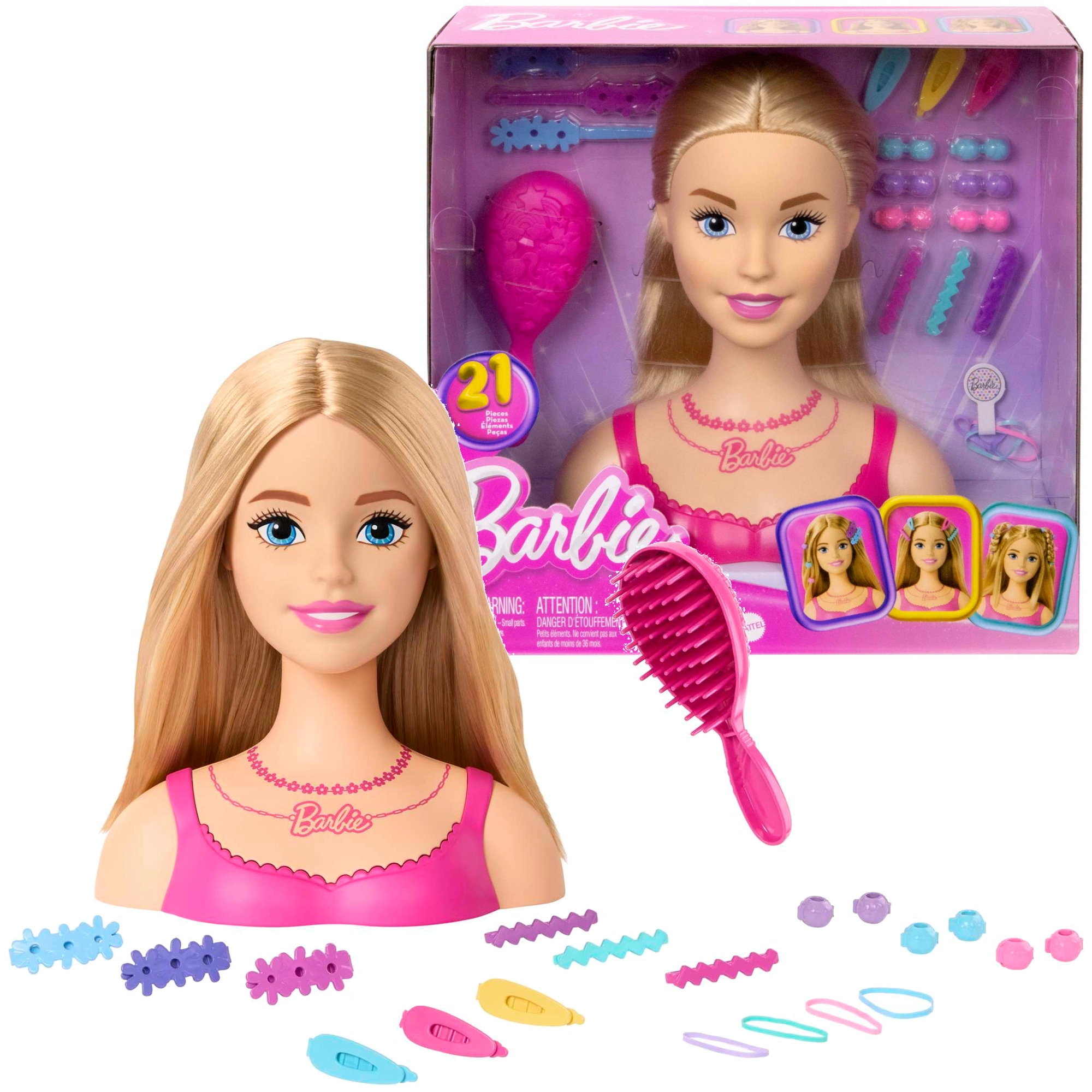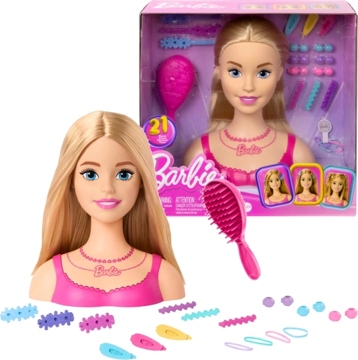 Ontdek de creatieve wereld van kapsels met de BARBIE kamm- en stylingskop en een uitgebreide set van 20 kleurrijke accessoires. Kinderen kunnen kammen, vlechten, versieren en de meest uiteenlopende kapsels uitproberen – van vlechtjes tot elegante knotten. De hoogwaardige afwerking van Mattel zorgt voor urenlang speelplezier en stimuleert creativiteit en fijne motoriek.