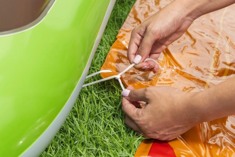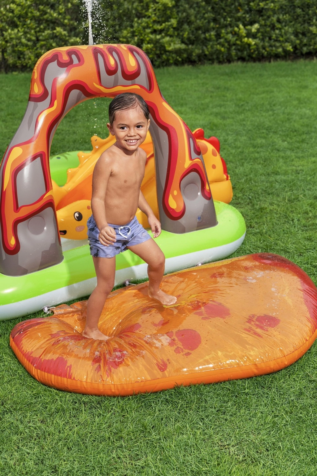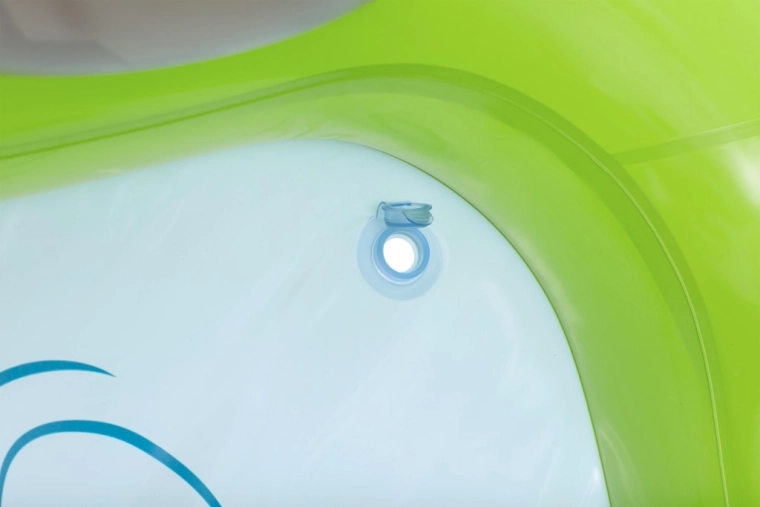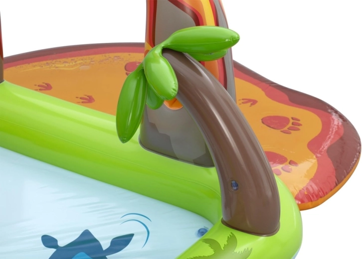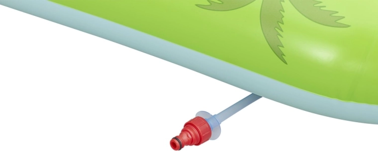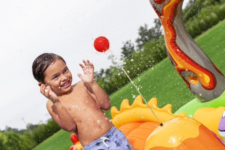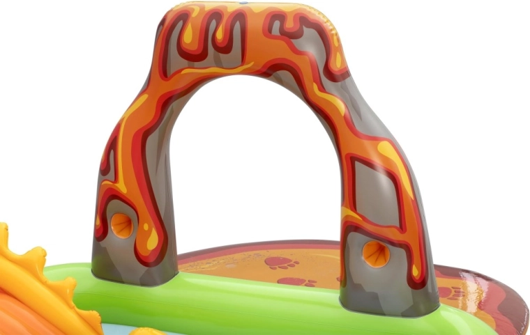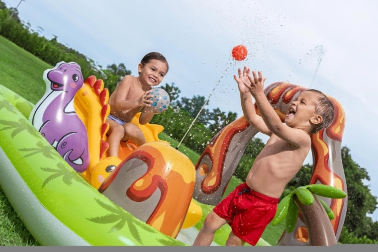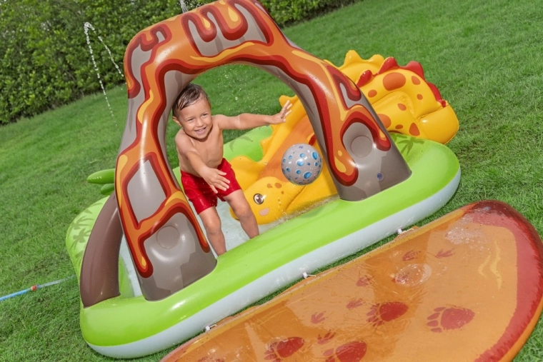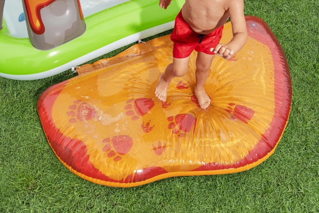Het opblaasbare speelcentrum met dinosaurussen is een ideale keuze voor actieve zomerse pret voor kinderen vanaf 2 jaar. Het groene badje met palmprint en blauwe bodem bevat ca. 150 l water, terwijl de aparte watermat met lavamotief nog eens 80 l toevoegt voor een zachte landing en speels getrappel. De geïntegreerde sproeier op de vulkanische boog sluit je eenvoudig aan op de tuinslang en tovert in een mum van tijd een verfrissende douche tevoorschijn.