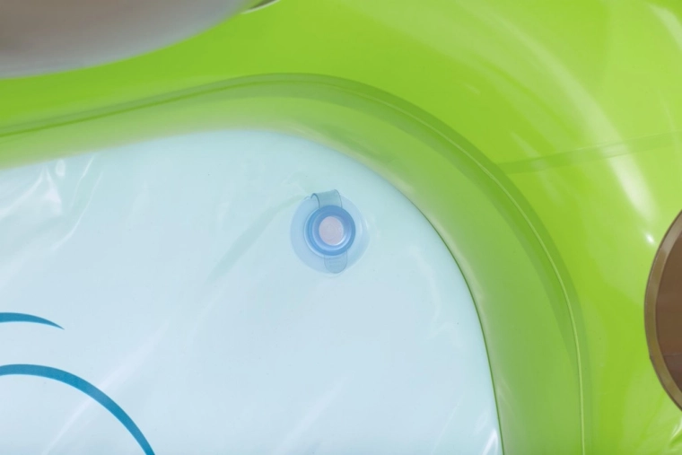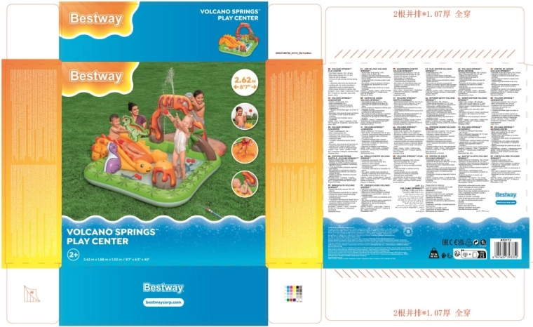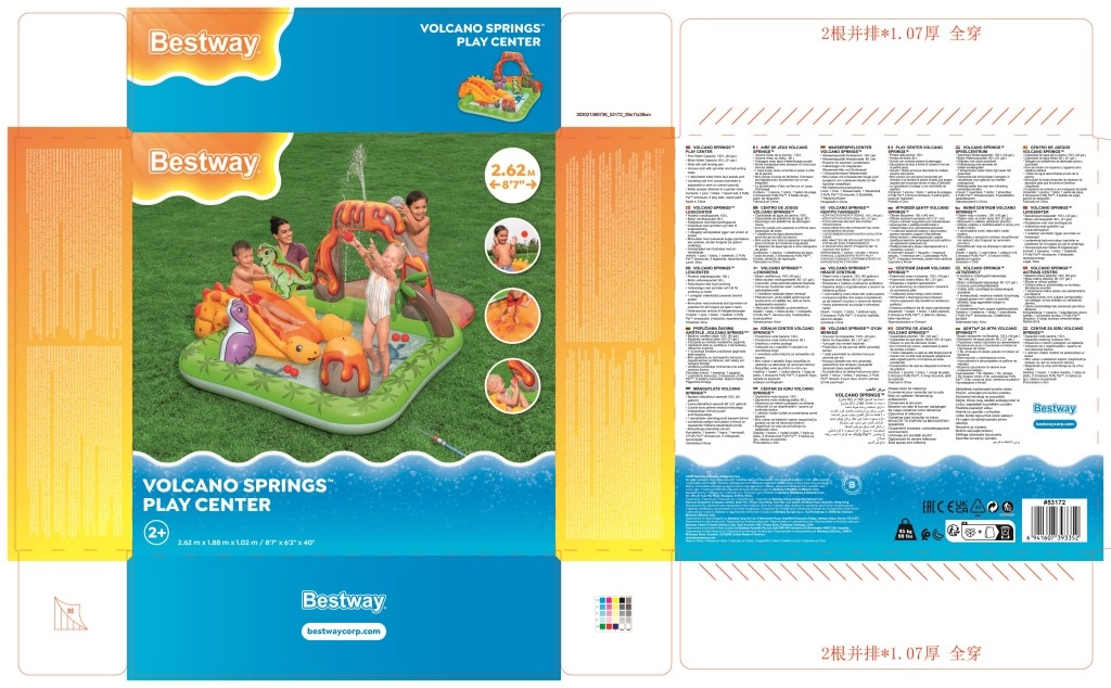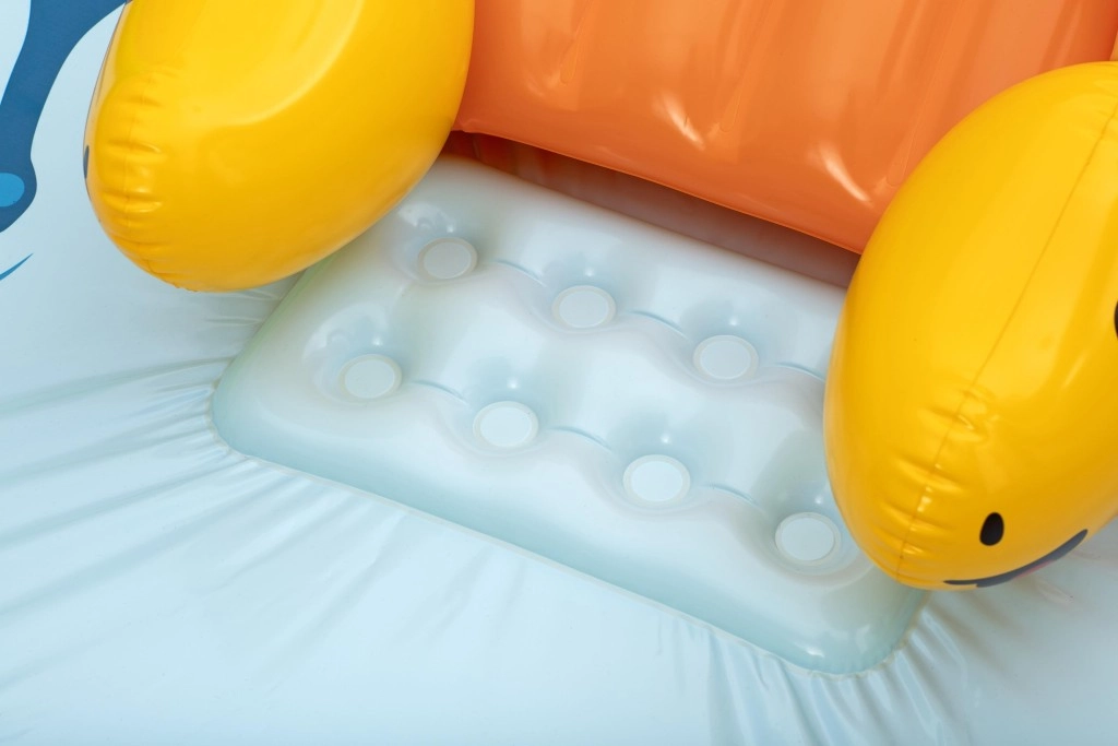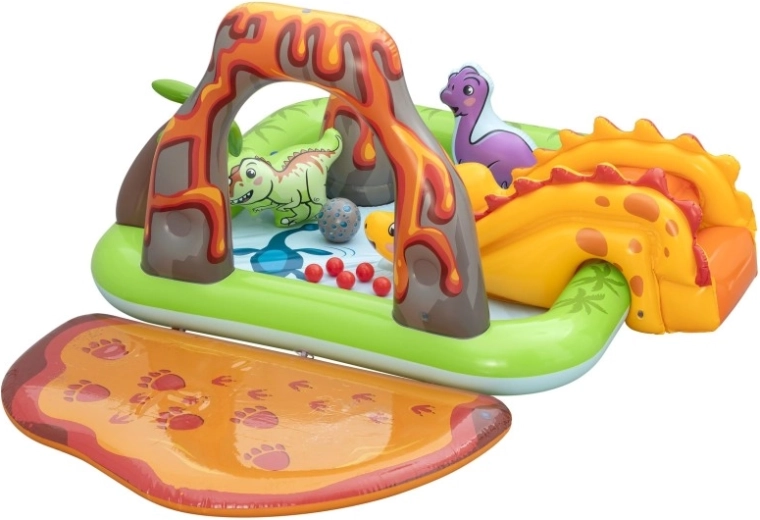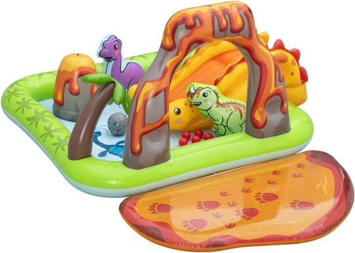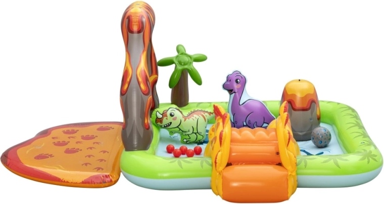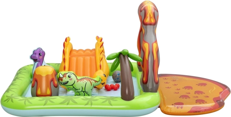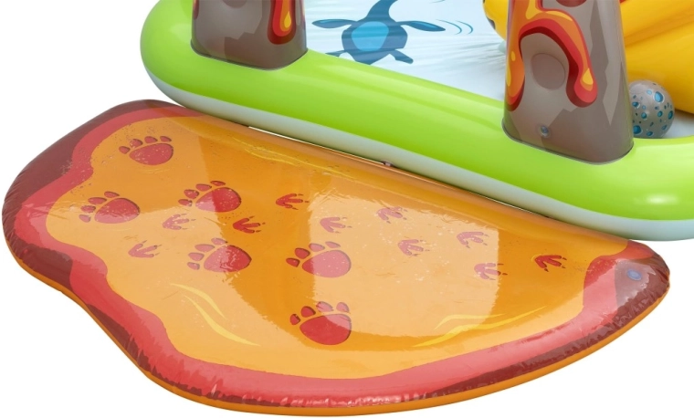 Het centrum omvat een gele dinosaurus met glijbaan, een opblaasbare groene en paarse dinosaurus als speelfiguren, een opening in de “vulkaan” voor het werpen van balletjes en een zacht landingskussen voor een veilige uitloop. Dankzij hoogwaardig vinyl, gladde naden en afgeronde randen is spelen comfortabel en veilig. Snel opblazen, eenvoudig leeglaten en de meegeleverde reparatiepatch maken onderhoud en opslag makkelijk.