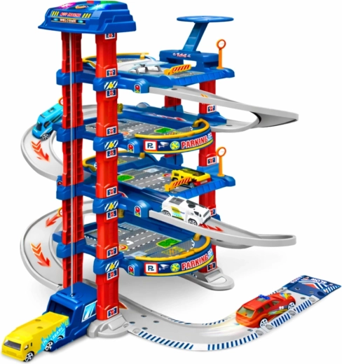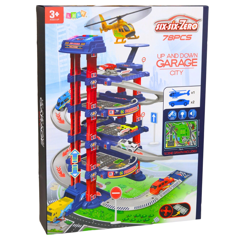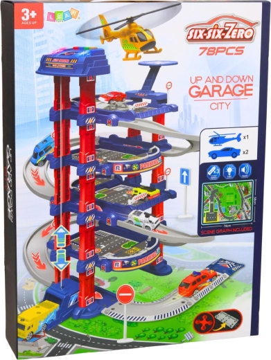 De grote kinderparkeergarage is ontworpen voor kleine autoliefhebbers en stadsverkeer-fans. De elektrische lift brengt de autootjes eenvoudig naar hogere verdiepingen, vanwaar ze naar beneden kunnen zoeven via de afrit/rijbaan. Ook inbegrepen zijn een landingsplatform voor een helikopter, verkeersborden en een speelmat die samen een realistische stedelijke omgeving creëren.