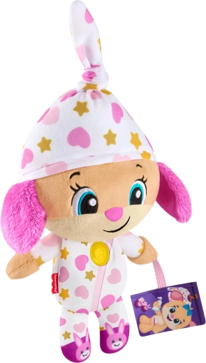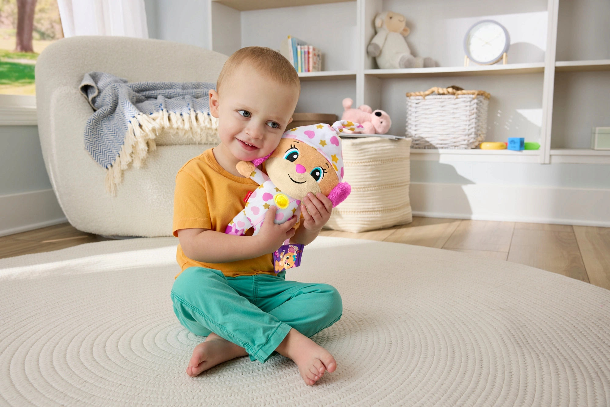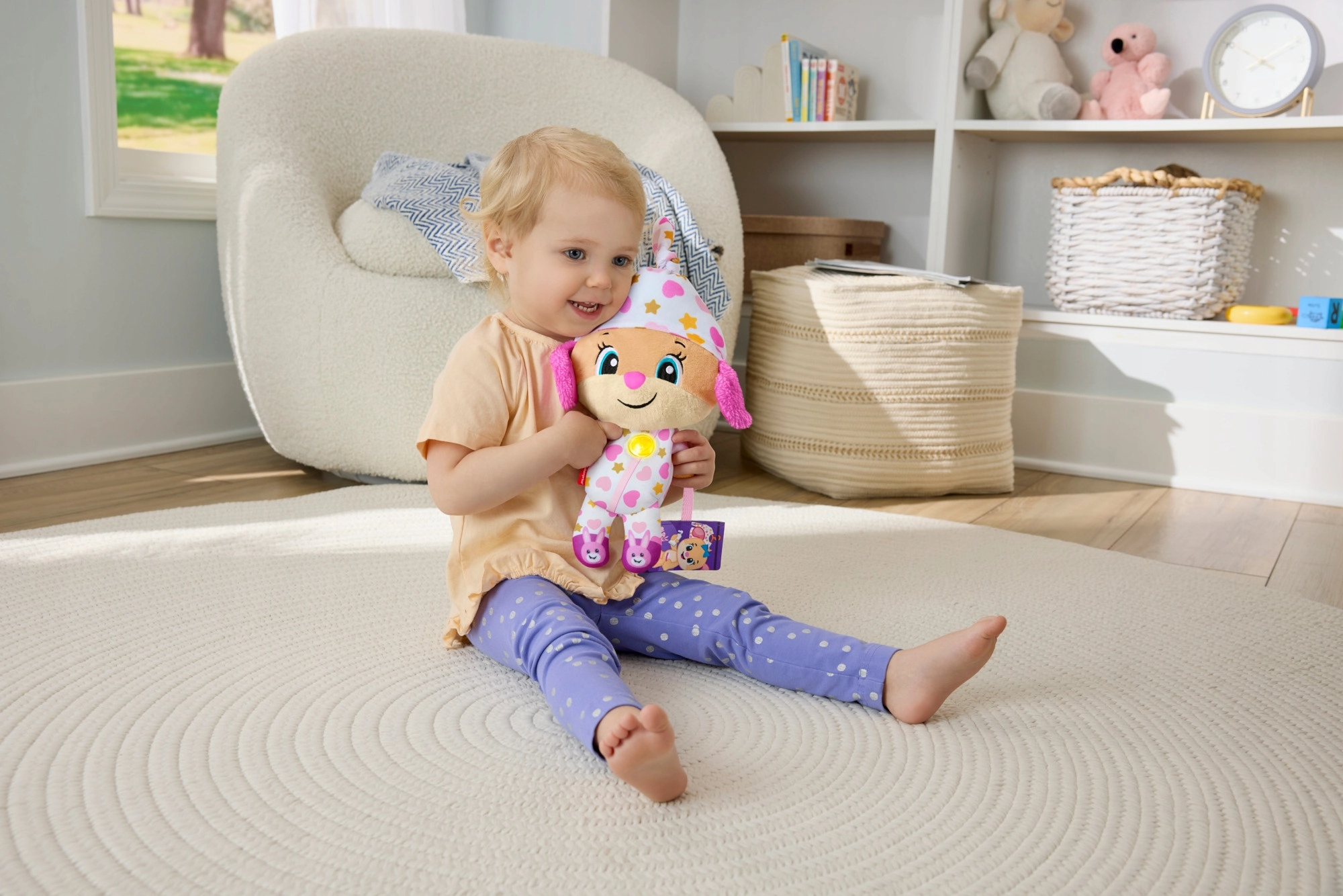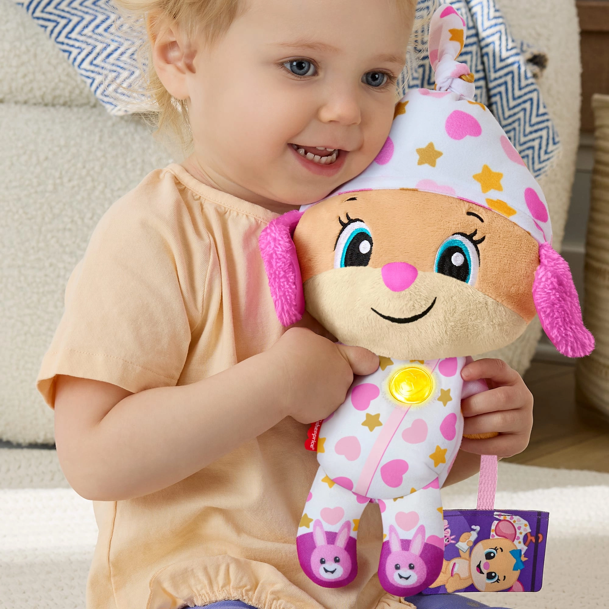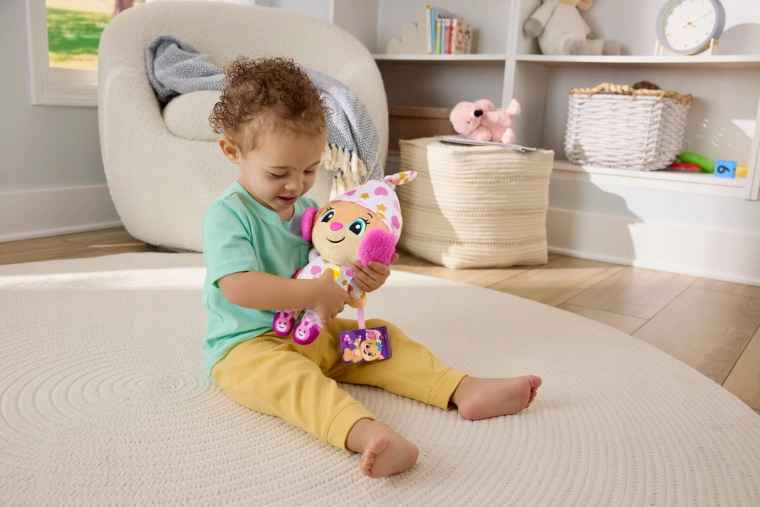 De interactieve pluche knuffel Lachen en Leren! is de ideale vriend voor avondrituelen en rustige momenten overdag. In pyjama met speelse patronen en met een oplichtend hartje creëert ze een prettige sfeer om te kalmeren, te ontspannen en in slaap te vallen.