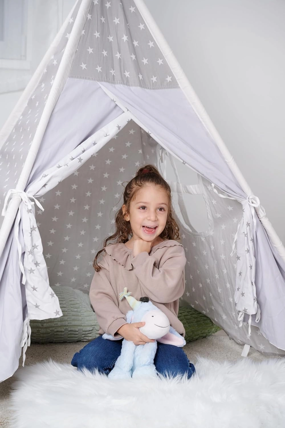 De zittende uitvoering behoudt zijn vorm, dus past hij mooi op een plank, in de leeshoek of in een tipi. Prachtige decoratie en speelgoed in één.