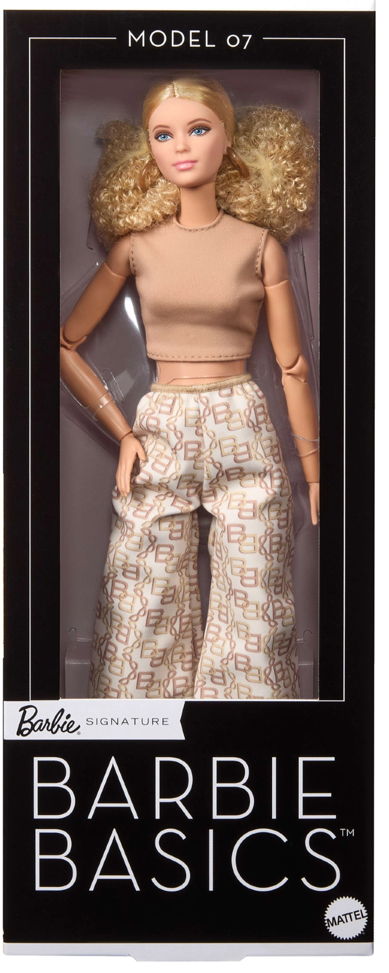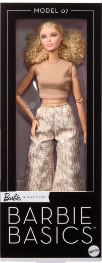 De BARBIE Signature Basics Model 07 pop viert minimalisme en moderne elegantie. Een zachte gelaatsuitdrukking met blauwe ogen, subtiele make-up en een lichte teint benadrukt haar klassieke schoonheid. Blond, krullend haar is gestyled in een eenvoudig kapsel dat past bij de cleane esthetiek van de hele serie.