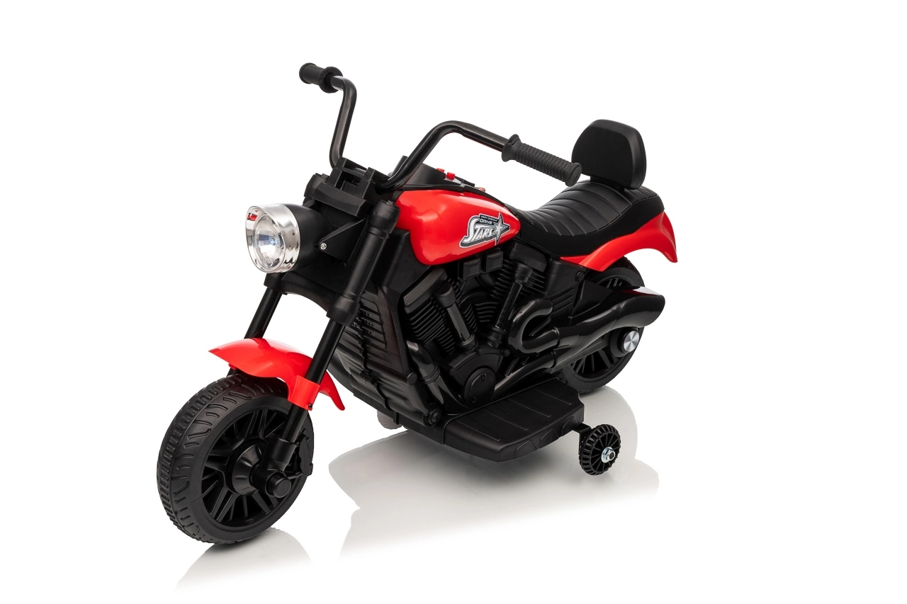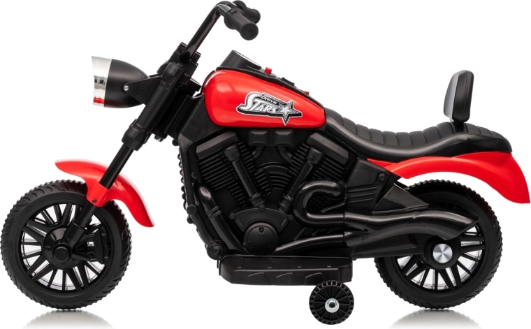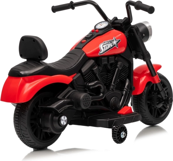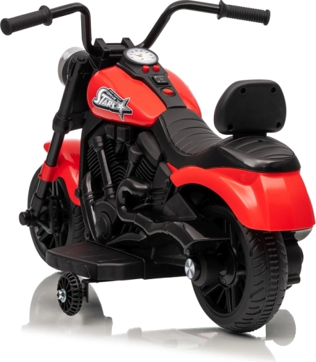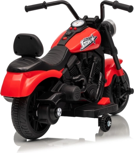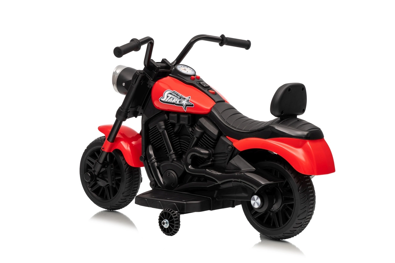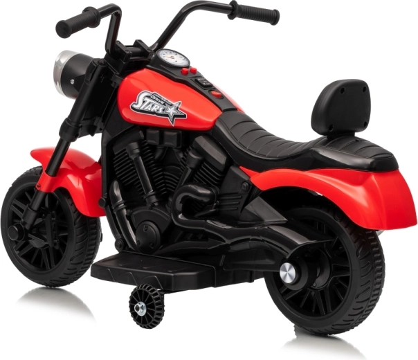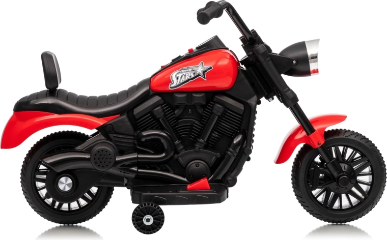 Stijlvolle elektrische kinder motor STAR in het rood biedt veilige pret voor jonge rijders. Voorzien van een 30 W motor, 6 V 4,5 Ah accu, langzame start voor een soepele wegrit, voor- en achteruit rijden en een voorste LED-koplamp. Zijwieltjes zorgen voor stabiliteit en het gevormde zadel met rugsteun biedt comfort.