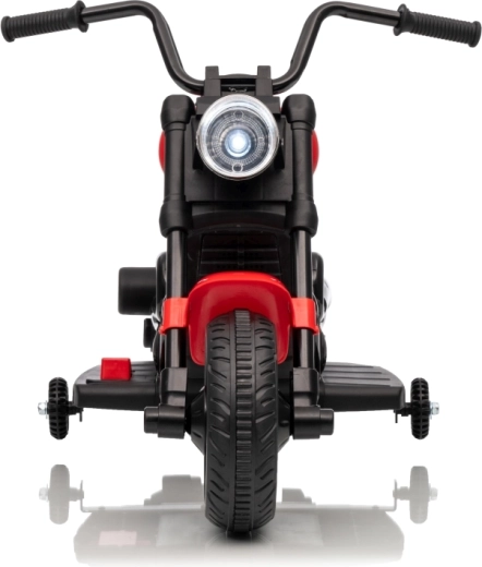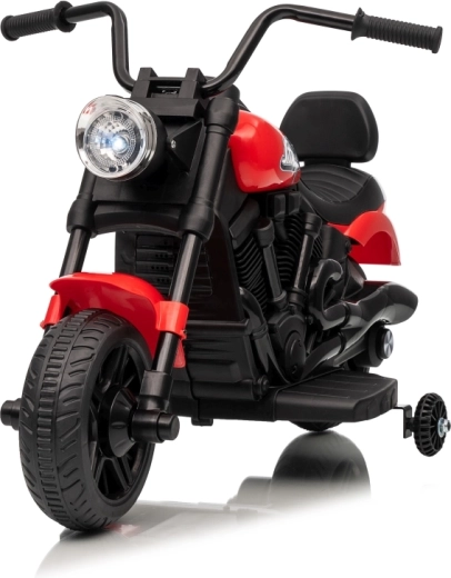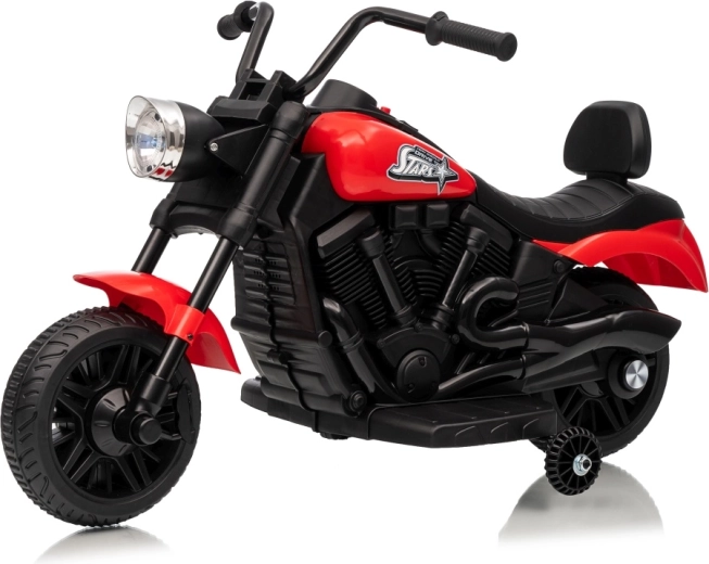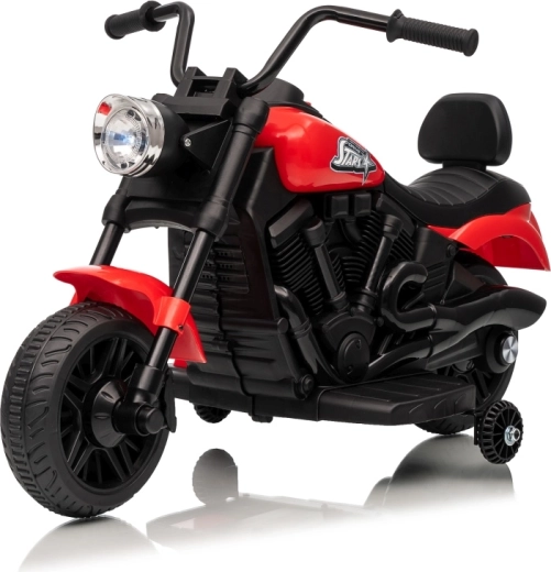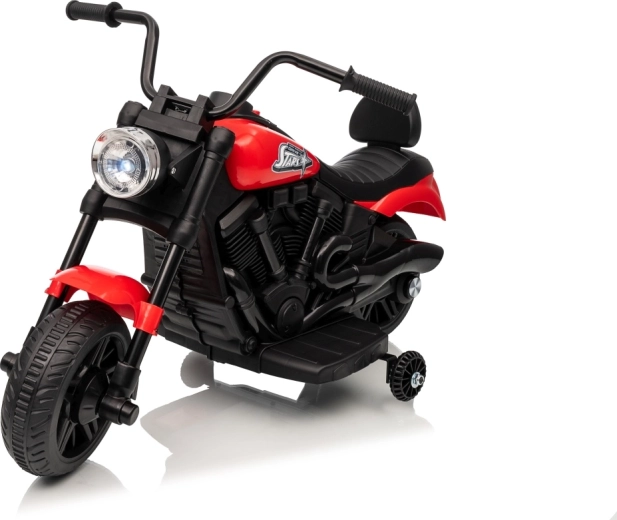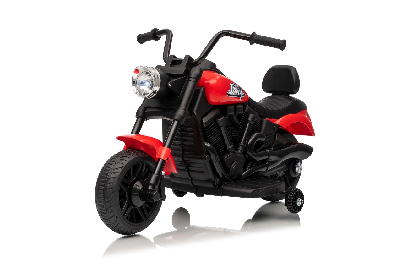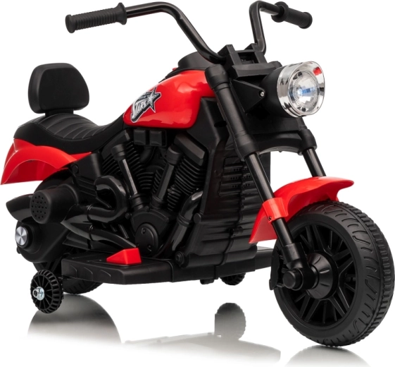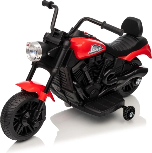 Stijlvolle elektrische kinder motor STAR in het rood biedt veilige pret voor jonge rijders. Voorzien van een 30 W motor, 6 V 4,5 Ah accu, langzame start voor een soepele wegrit, voor- en achteruit rijden en een voorste LED-koplamp. Zijwieltjes zorgen voor stabiliteit en het gevormde zadel met rugsteun biedt comfort.