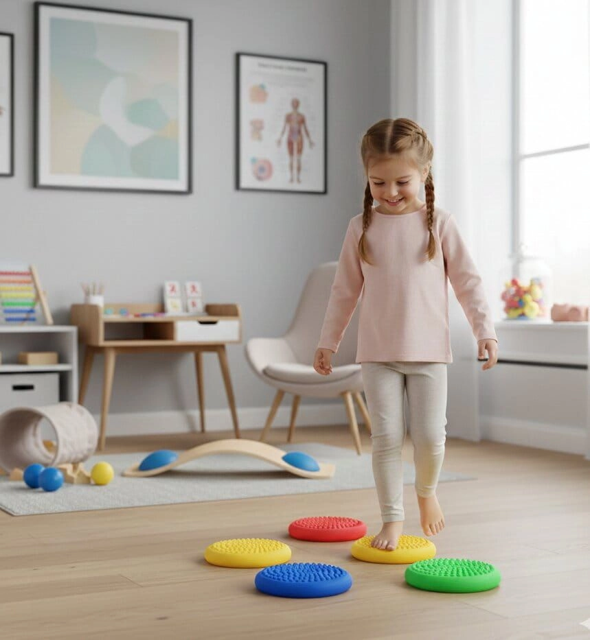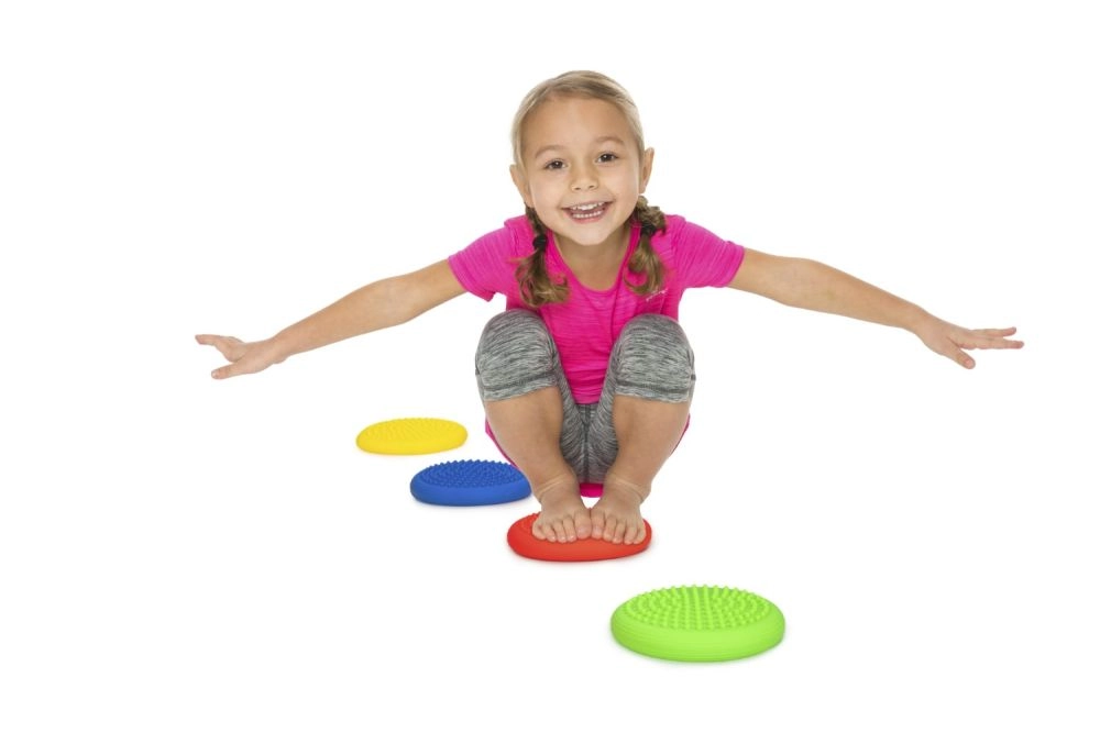 Kleurige schijven motiveren kinderen om te bewegen, ontwikkelen coördinatie en proprioceptie en versterken het diepe stabilisatiesysteem.