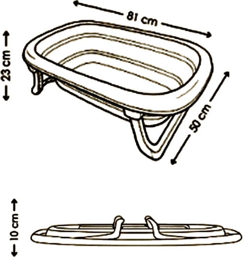 Het badje vouwt op tot een hoogte van ongeveer 10 cm. Inklapbare pootjes en een ruimtebesparende constructie besparen plaats en maken dragen en opbergen eenvoudiger.