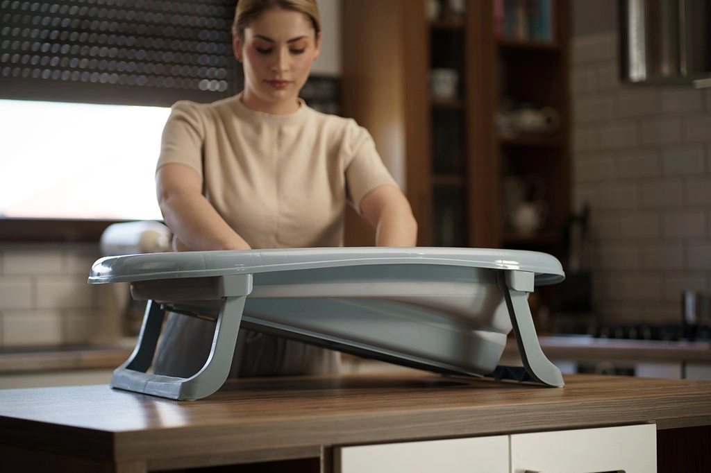 Het ergonomisch ontworpen badje vouwt eenvoudig op tot een hoogte van circa 10 cm en bespaart zo ruimte in de badkamer en thuis. De stabiele kunststof pootjes klappen gemakkelijk onder het badje en garanderen een veilige en stevige plaatsing tijdens het baden.