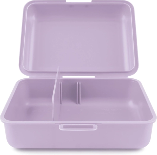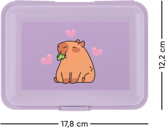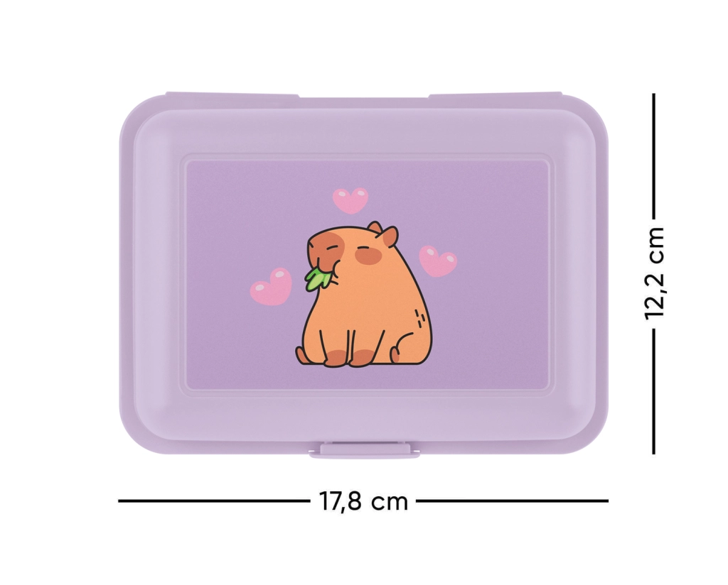 Praktische en duurzame lunchbox in een elegante paarse kleur met capibara-motief. Dankzij het eenvoudige sluitsysteem met één clip en de interne verdelerscheiding blijven etenswaren overzichtelijk gescheiden en vers. Een uitstekende keuze voor school, uitstapjes en dagelijks gebruik.