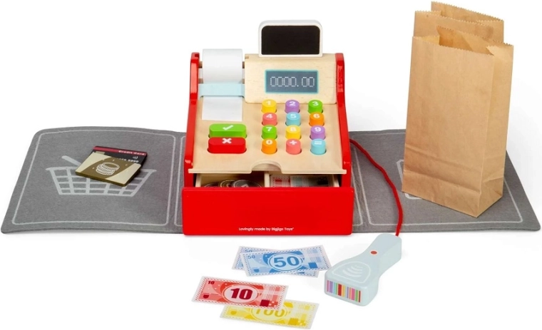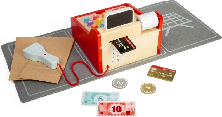 Stijlvolle houten kassa voor kleine verkopers die elke kinderwinkel in een realistische winkel verandert. Kinderen kunnen artikelen scannen, prijzen berekenen, een bon uitgeven en betalen met kaart of contant. Grote knoppen voor kleine handjes, de meegeleverde scanner en accessoires stimuleren rollenspel, de ontwikkeling van communicatie, sociale vaardigheden en financiële geletterdheid. Gemaakt van FSC®-hout – milieuvriendelijk en duurzaam voor dagelijks speelplezier.