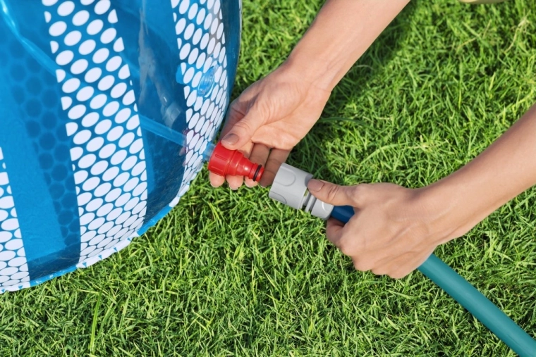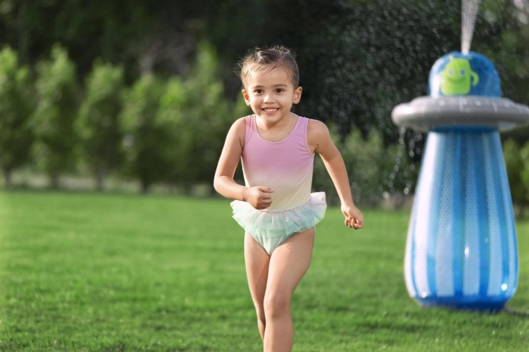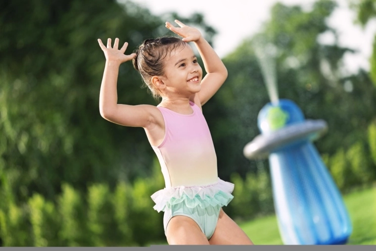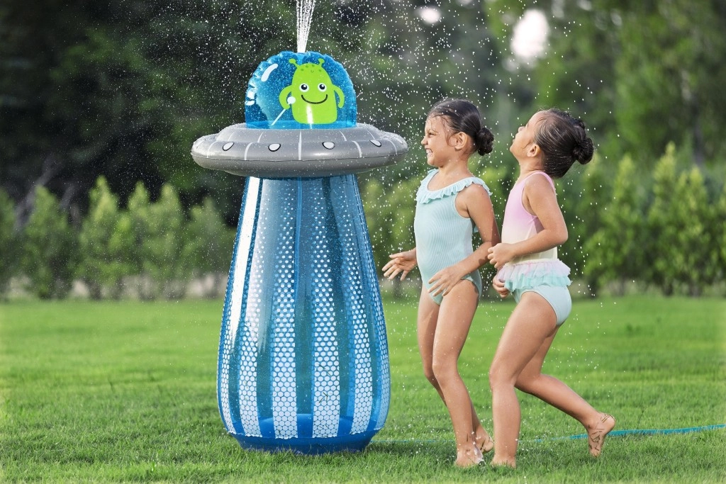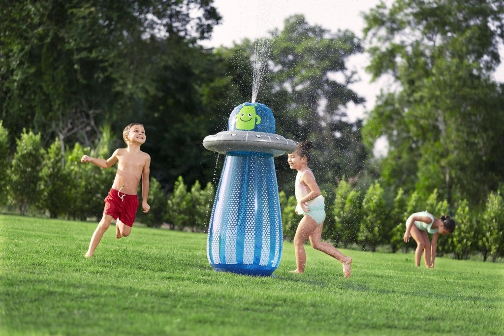 Na aansluiting op een standaard tuinslang verandert de bovenzijde van de UFO in een verfrissende sproeier die een speelse fontein voor kinderen creëert.