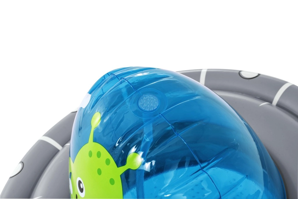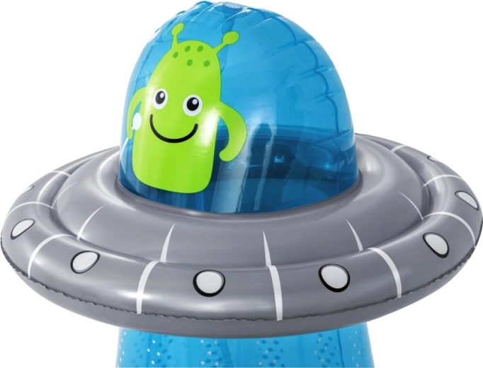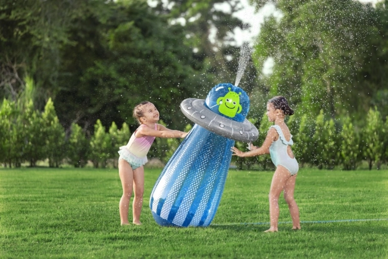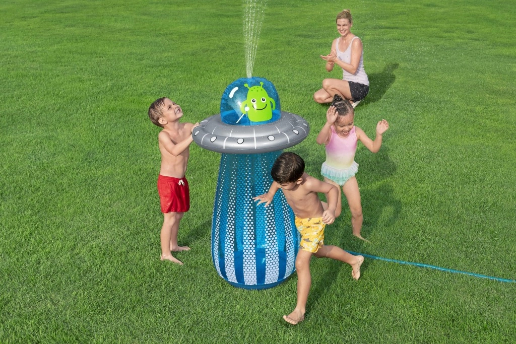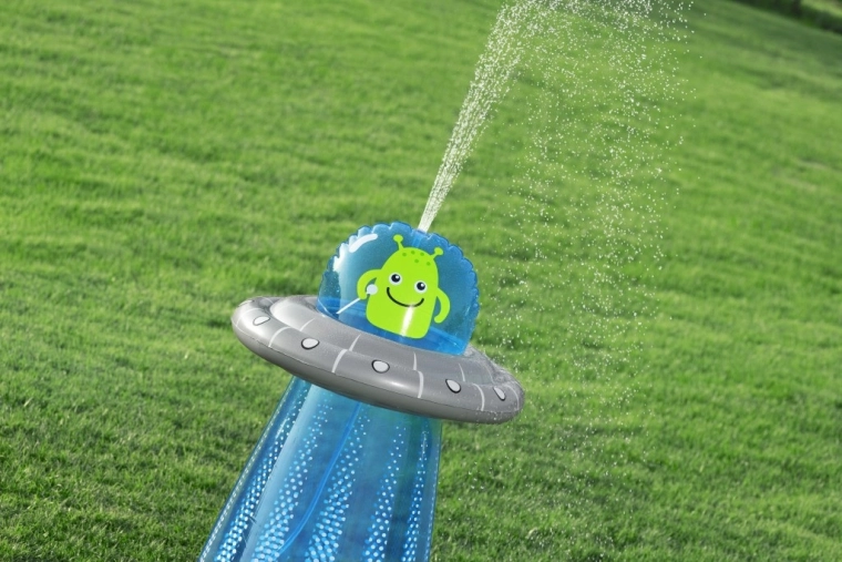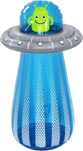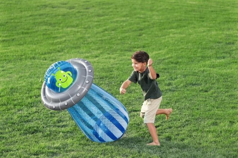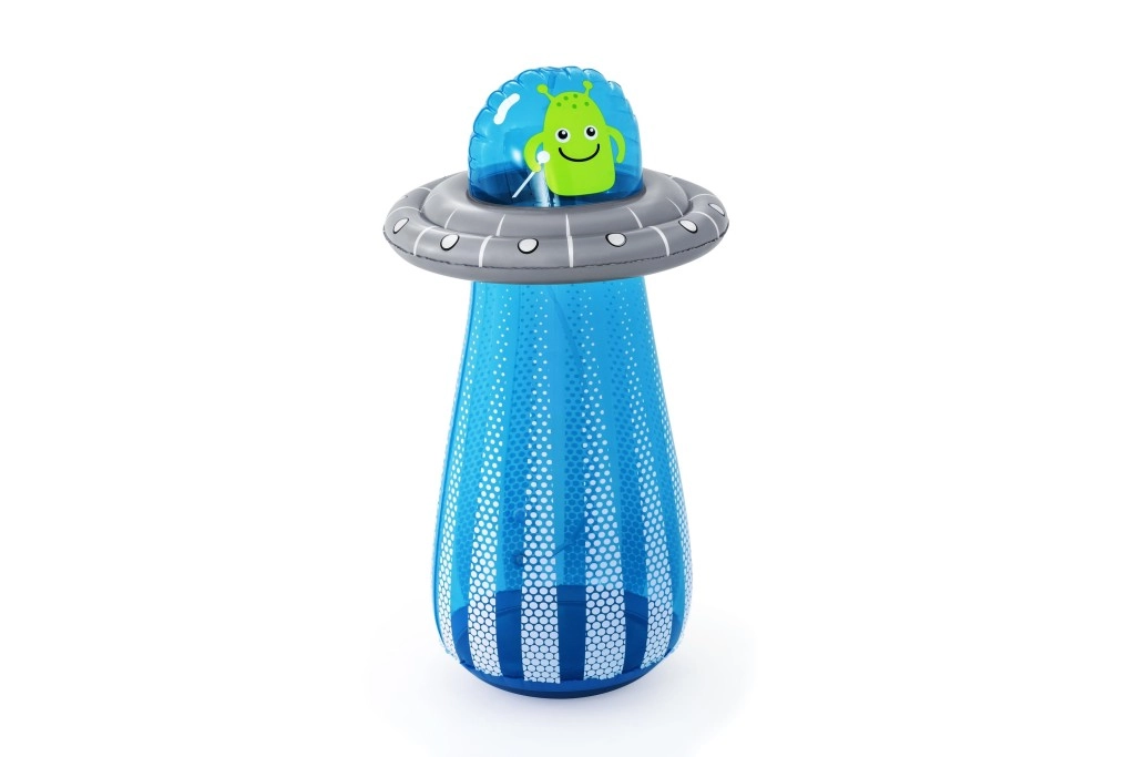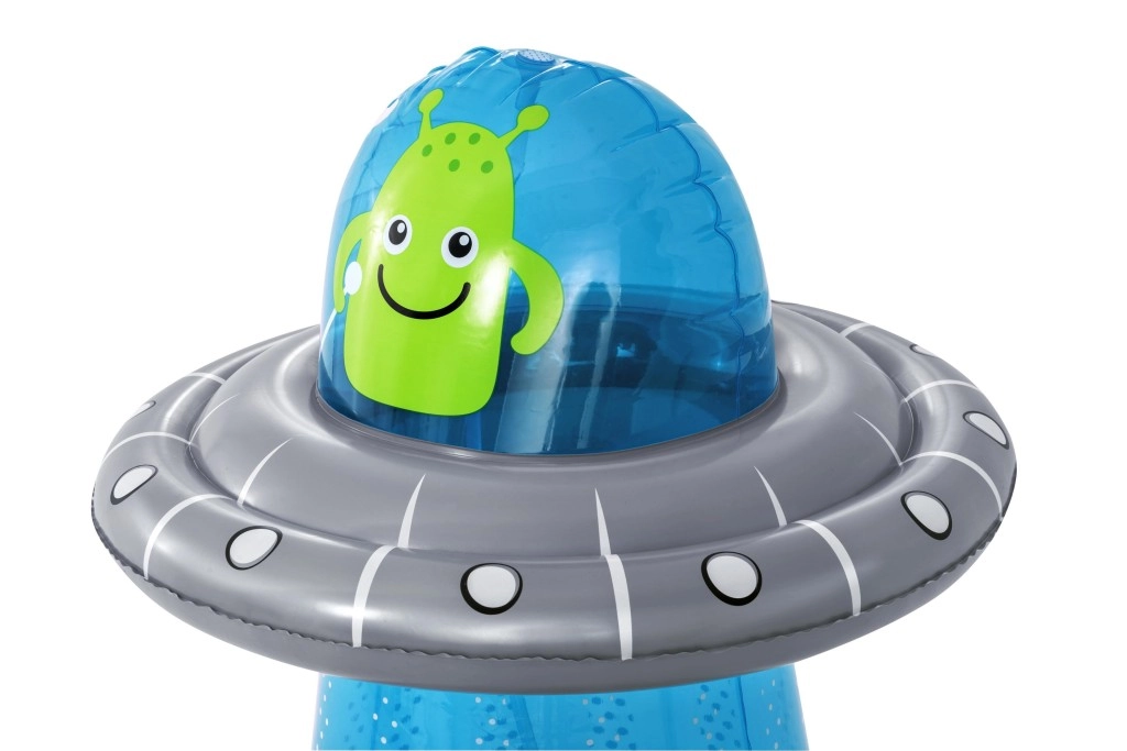 De opblaasbare UFO met een vriendelijke alien biedt kinderen actieve beweging en waterverfrissing in één. Na aansluiting van de slang ontstaat er aan de bovenzijde een waterfontein die de tuin omtovert tot een speelse zomerse speeltuin. Dankzij de ingebouwde waterkamer aan de onderzijde is het speelgoed stabiel en veert het na stoten soepel terug.