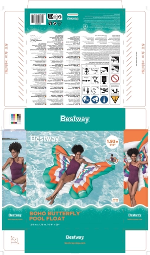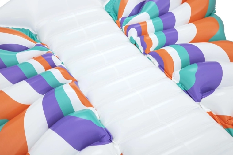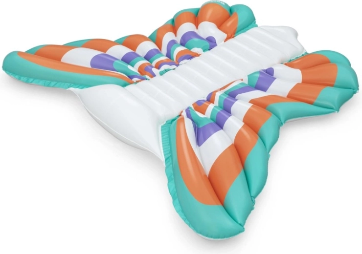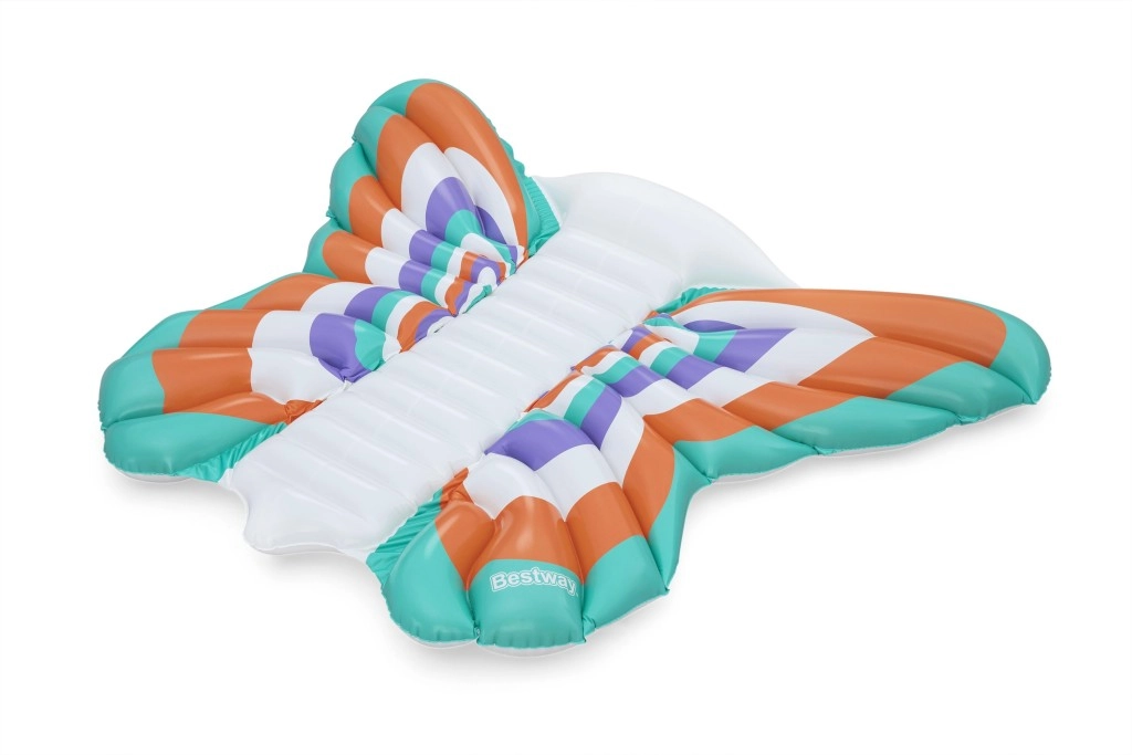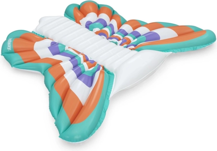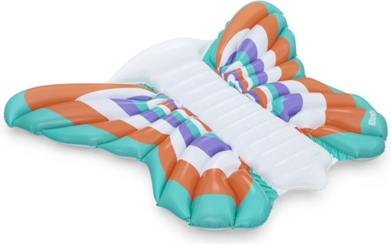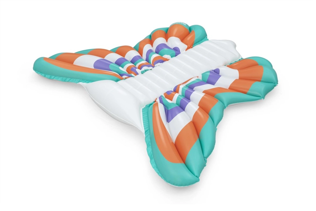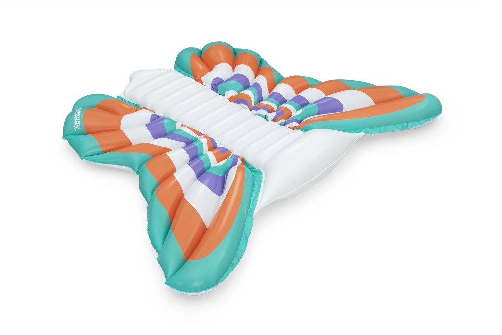 Deze stijlvolle opblaasbare mat met vlindervleugel-design combineert comfort en plezier. Gekleurde panelen in oranje, turquoise, paars en wit zorgen voor een opvallende look, terwijl de geribbelde middenstrook comfortabele rugsteun biedt en een ontspannen houding op het water.