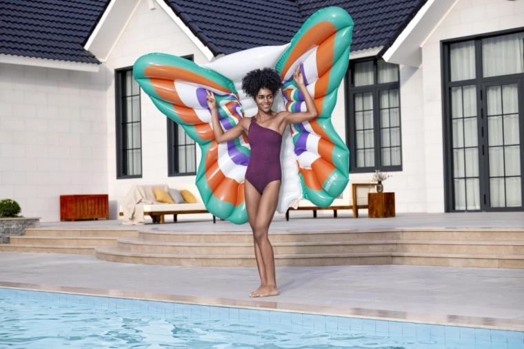 Geniet van de zomer op het water met dit opblaasbare luchtbed in vlindervorm van 193 × 176 cm. Het biedt ruim en comfortabel liggen, stabiliteit op het wateroppervlak en duurzaam materiaal met Color Shield™-technologie, dat de kleuren levendig houdt en niet afgeeft op natte huid. Dankzij de maximale draagkracht van 100 kg en het snelle opblaasventiel is het ideaal voor in het zwembad, op het meer en aan zee.