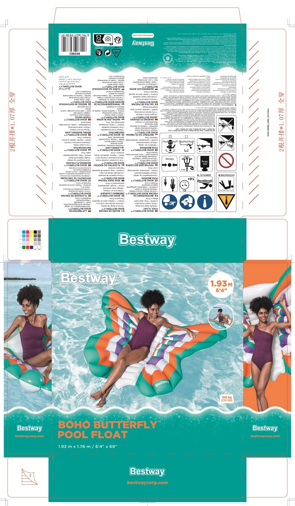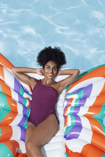 De duurzame constructie met Color Shield™-technologie zorgt ervoor dat de print niet afgeeft op natte huid en langdurig helder en intens blijft. Brede vleugels geven het luchtbed uitstekende stabiliteit op het wateroppervlak, en meerdere luchtkamers helpen bij een betere balans en een draagkracht tot 100 kg.
