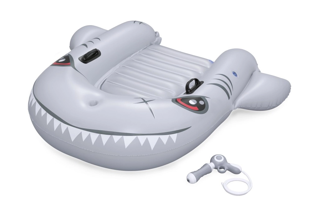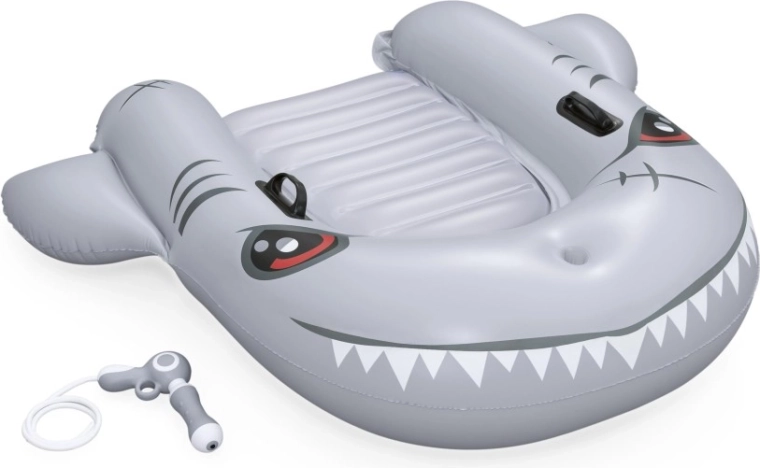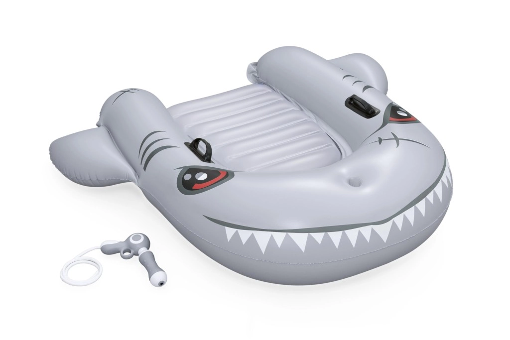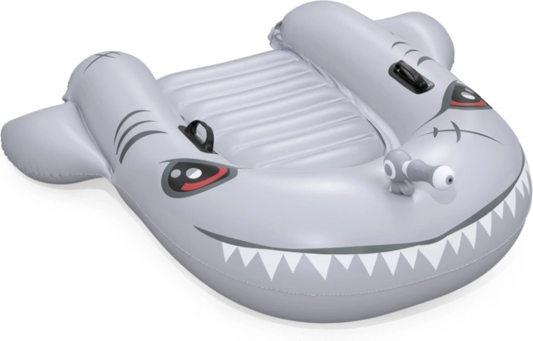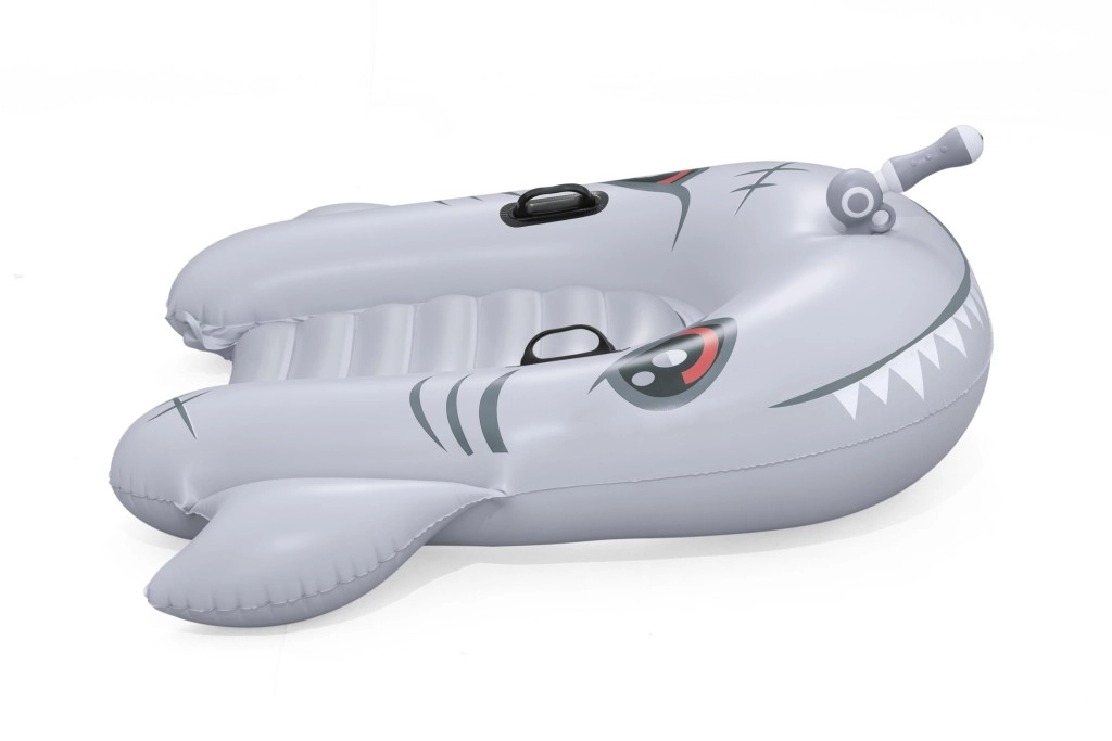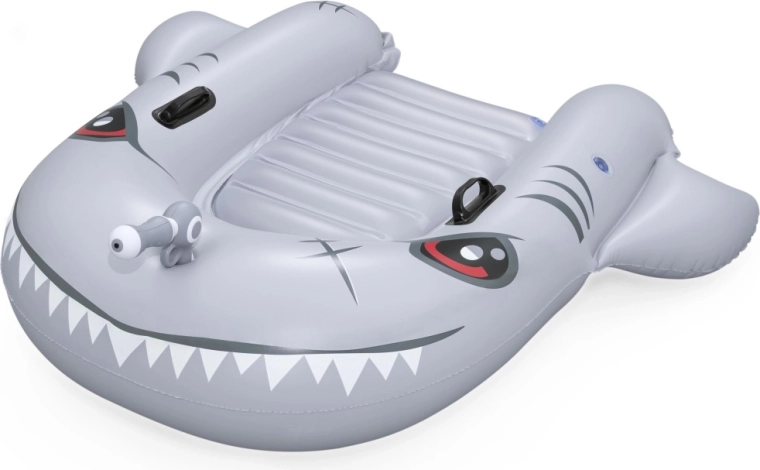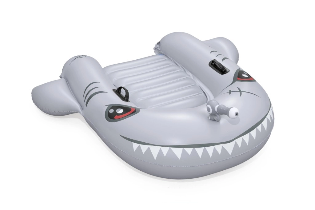 Het opblaasbare vaartuig in haaivorm brengt zowel plezier als comfort naar het zwembad. Het realistische grijs-zilveren design met ogen en tanden valt meteen op, terwijl de geribbelde zitting en verhoogde zijkanten zorgen voor een stabiele en comfortabele zit. Twee stevige handgrepen helpen kinderen hun evenwicht te bewaren en eenvoudig te manoeuvreren.