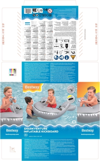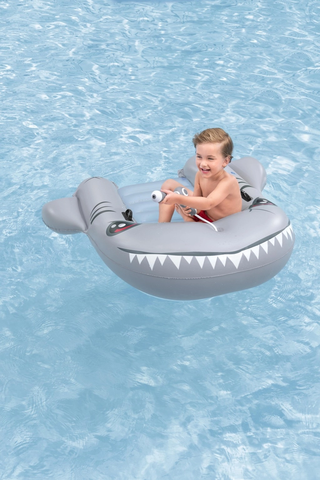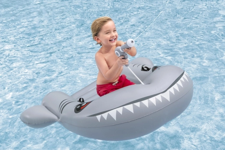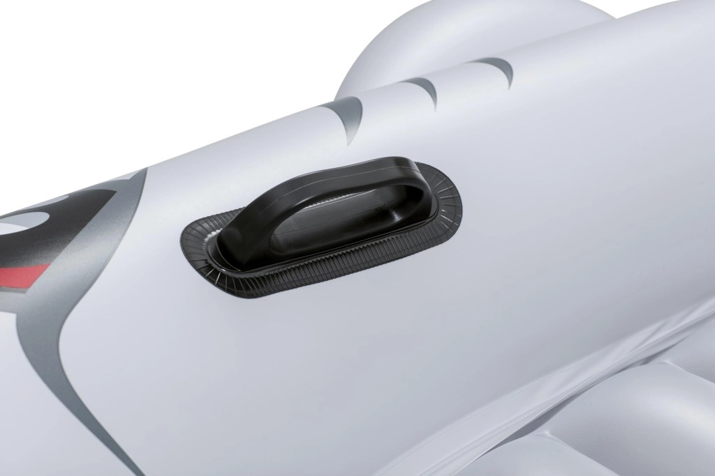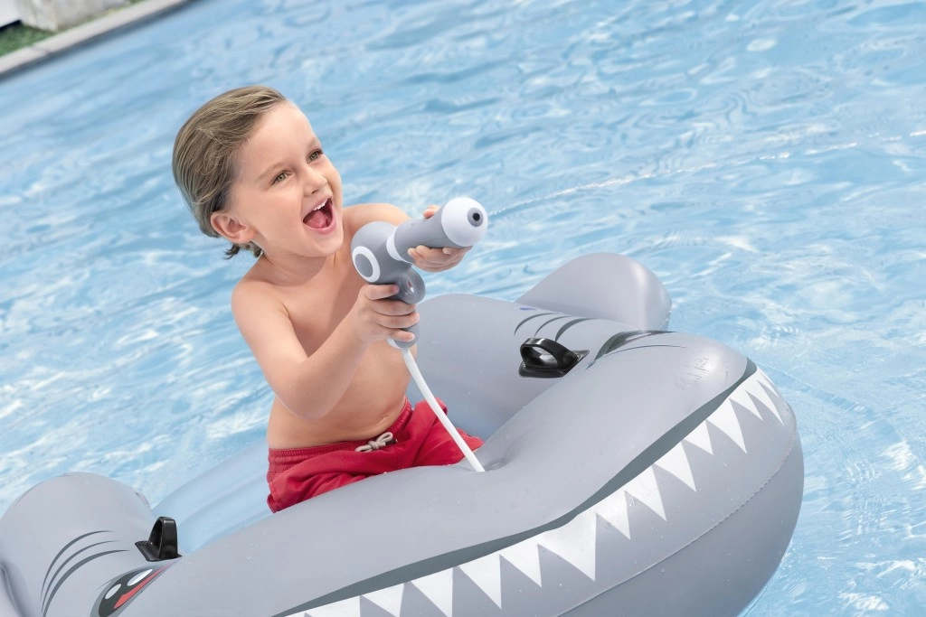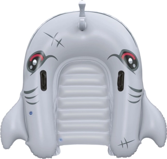 Het opblaasbare vaartuig in haaivorm brengt zowel plezier als comfort naar het zwembad. Het realistische grijs-zilveren design met ogen en tanden valt meteen op, terwijl de geribbelde zitting en verhoogde zijkanten zorgen voor een stabiele en comfortabele zit. Twee stevige handgrepen helpen kinderen hun evenwicht te bewaren en eenvoudig te manoeuvreren.