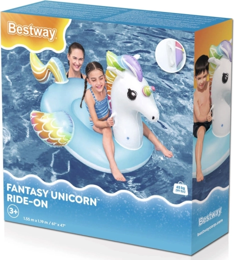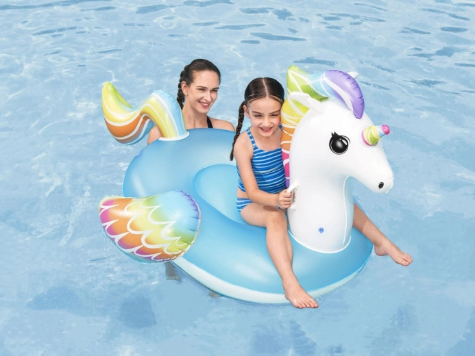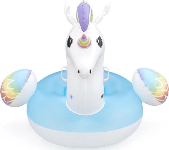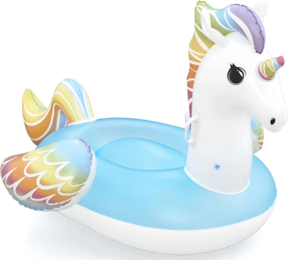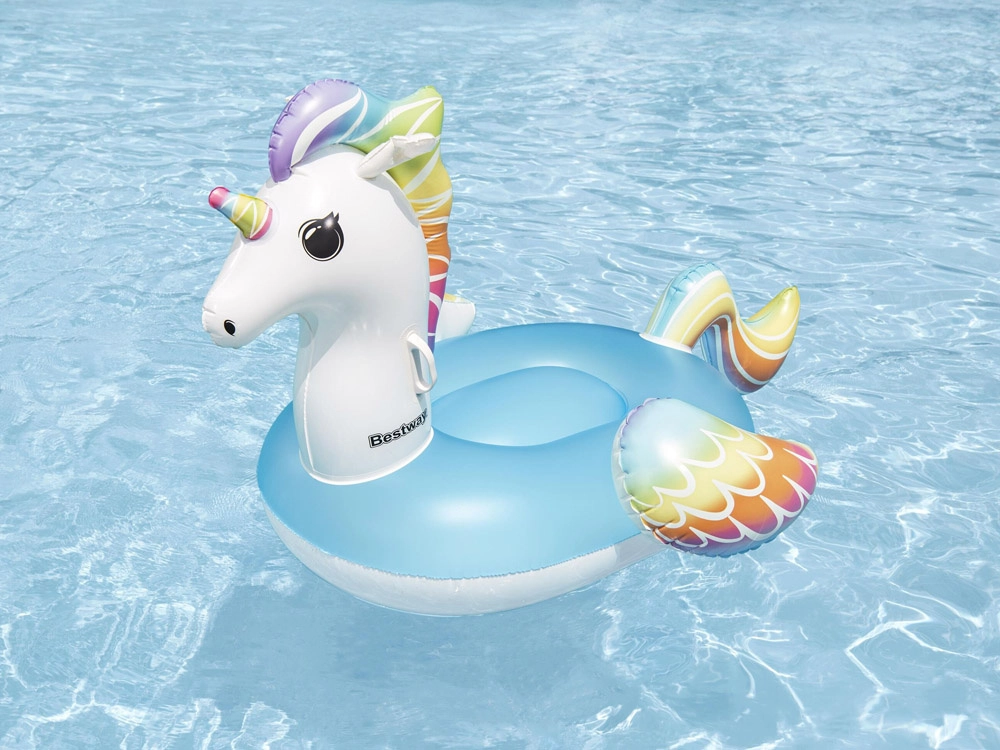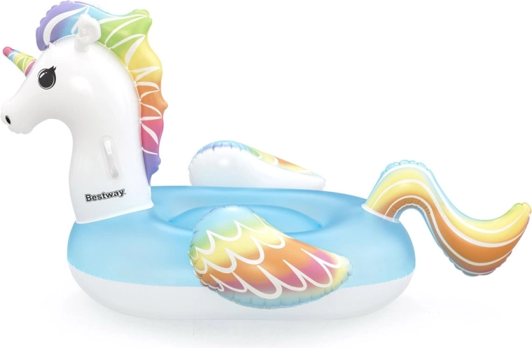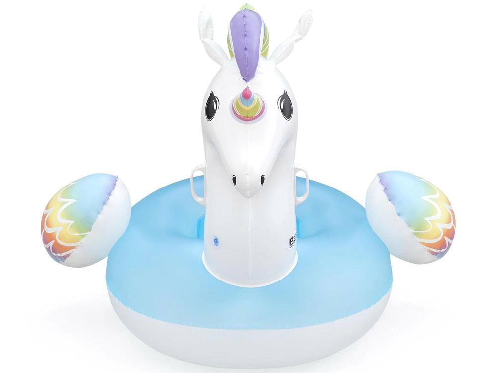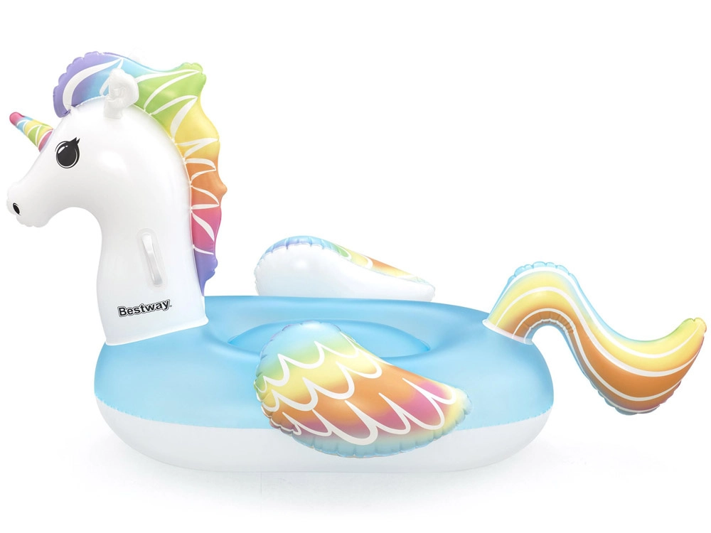 De opblaasbare Bestway-eenhoorn in felle kleuren met vleugels en regenboogmanen is de perfecte keuze voor zomers waterplezier. Dankzij de stabiele constructie en praktische handgrepen genieten kinderen van comfortabel glijden en veiliger spelen op het wateroppervlak.