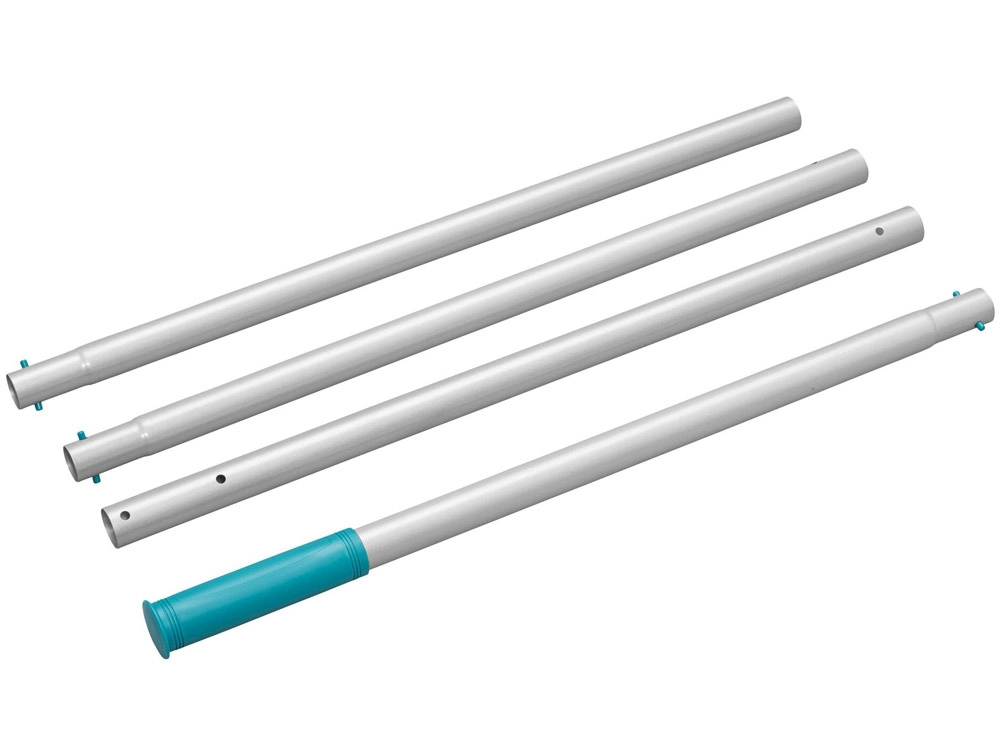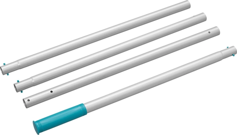 Lichte, monteerbare stok met snelvergrendeling en twee opzetstukken voor bodem, wanden, hoeken en treden. Eenvoudig manoeuvreren en effectief reinigen van het hele zwembad.