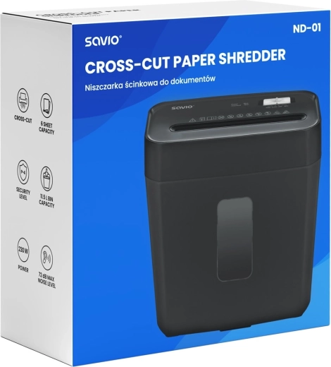 De compacte ND-01 shredder beschermt uw privacy dankzij de kruissnede (cross-cut) van 4 × 32 mm en de veiligheidsklasse P-4. Verwerkt tot 6 vellen tegelijk, kan overweg met nietjes, paperclips en betaalkaarten, heeft een opvangbak van 11,5 l en stille werking rond 72 dB – ideaal voor thuis en kleine kantoren.