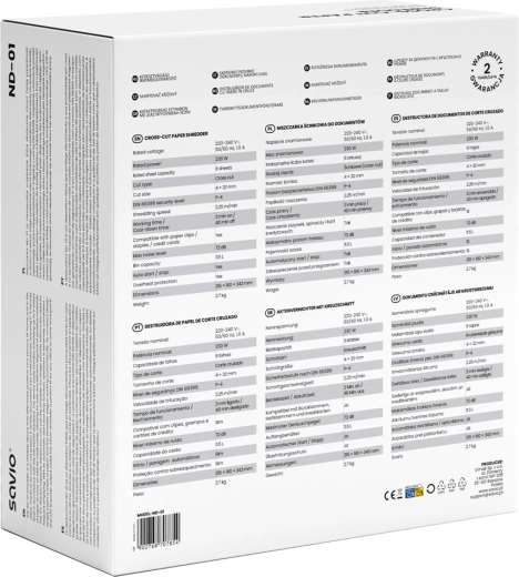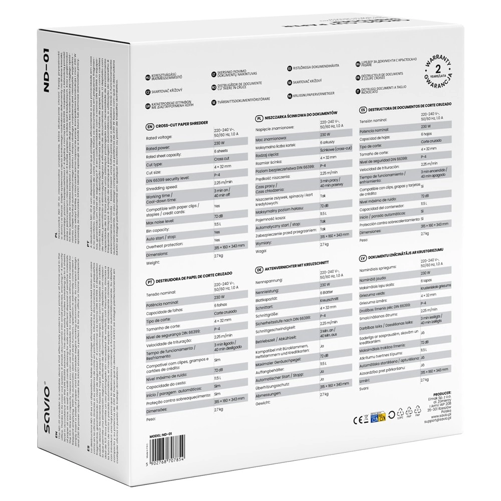 De ND-01 shredder is een betrouwbare oplossing voor dagelijkse bescherming van gevoelige gegevens. Dankzij de kruissnede van 4 × 32 mm en de DIN 66399-norm, niveau P-4 worden persoonlijke en zakelijke documenten veilig vernietigd. De compacte afmetingen passen gemakkelijk onder een bureau en het kijkvenster van de bak helpt de vulling te controleren.
