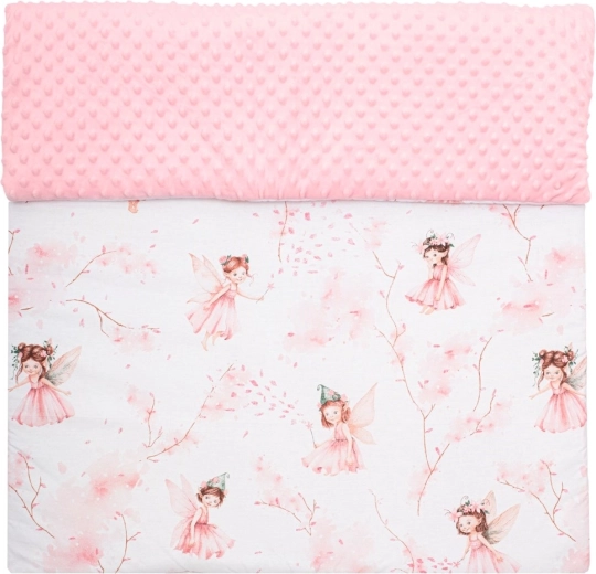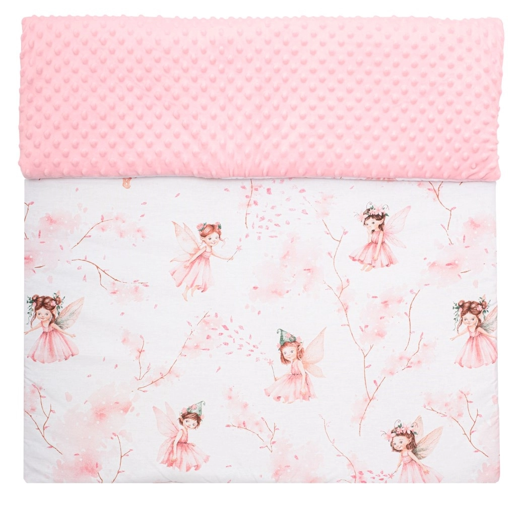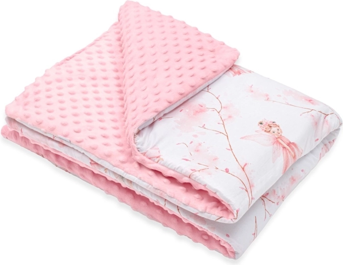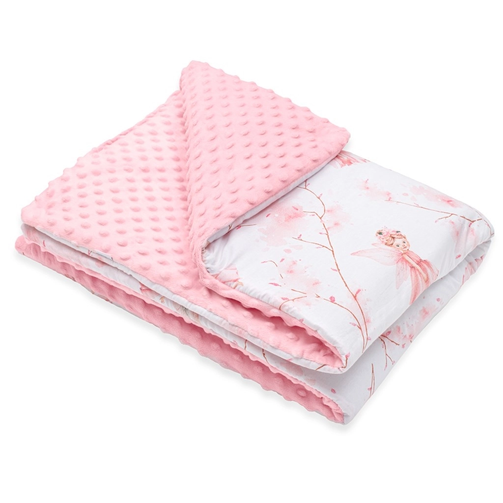 Zachte babydeken New Baby met feeën-motief, combineert fijne minky-stof met 3D‑stipjes voor zintuiglijke stimulatie en ademende 100% katoen met een subtiele print. Dankzij de anti‑allergene vulling is de deken aangenaam warm, ideaal voor in de kinderwagen, het ledikant en het autostoeltje. Geeft niet af, is zacht voor de gevoelige huid en vrij van knopen of harde onderdelen voor maximale veiligheid.