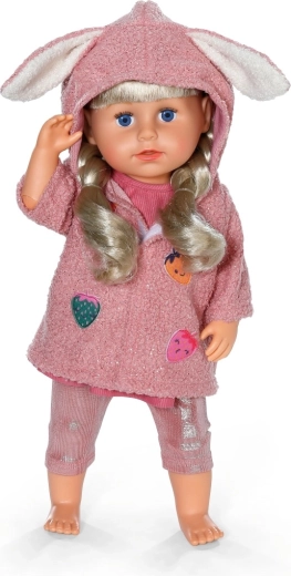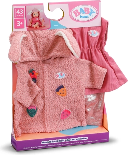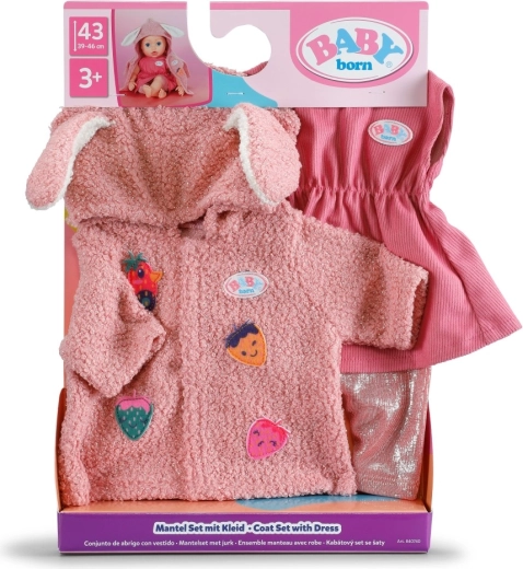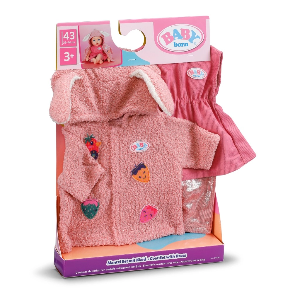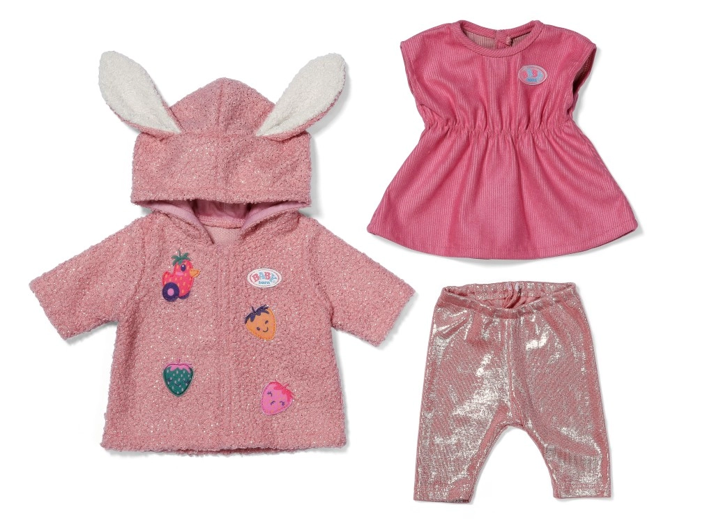 Schattige set voor poppen van 43 cm die jouw BABY born in een klein konijntje verandert. Bevat een zacht jasje met capuchon en oortjes, een jurkje en glanzende leggings – ideaal om het hele jaar door mee te spelen. Pluizig jasje met oortjes, aardbeidetails en moderne roze tinten geven de pop een frisse look en comfort op koelere dagen.