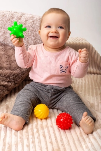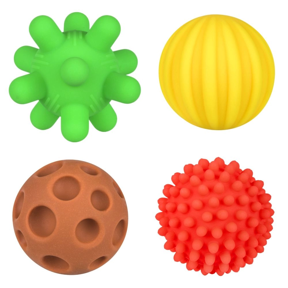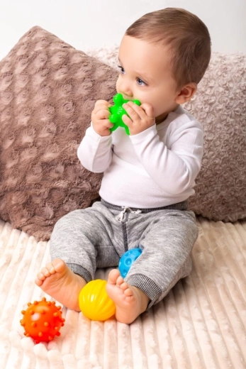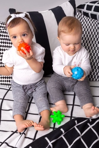 Elke bal heeft een ander oppervlak voor diverse soorten stimulatie: geribbeld, met nopjes, fijn gegroefd of “stekelig” voor massage van de handpalmen. De zachte, samendrukbare uitvoering is vriendelijk voor het tandvlees en ondersteunt veilig bijten.