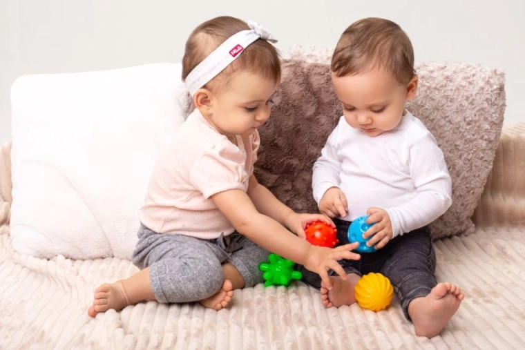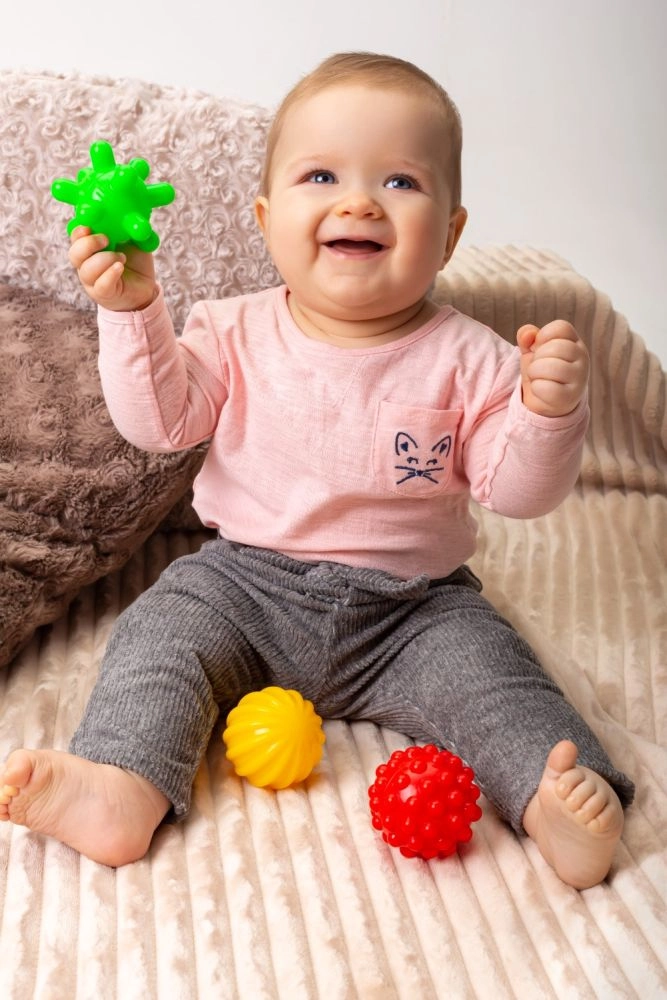 Elke bal biedt een ander oppervlak om de tastzin te stimuleren, de handpalmen te masseren en de grijpreflex te trainen – ideaal voor de ontwikkeling van de fijne motoriek.