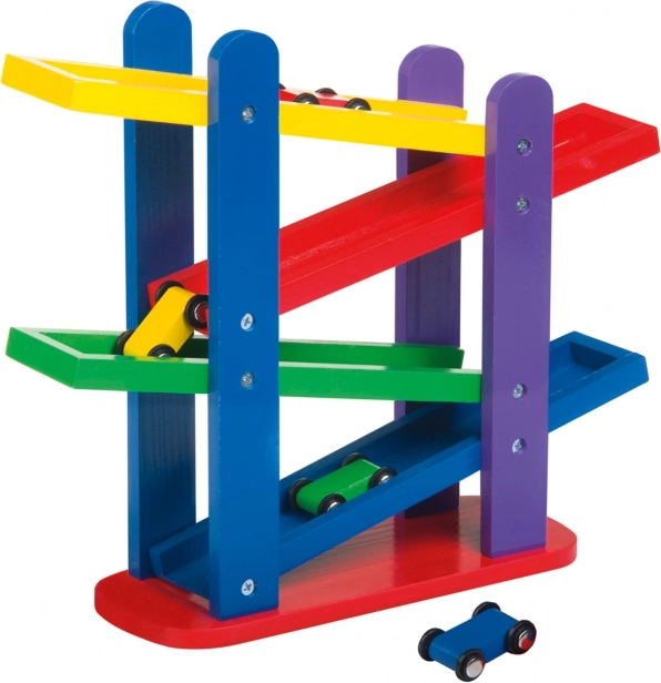 De houten racebaan met drie gekleurde autootjes zorgt voor eindeloos speelplezier dankzij het gemakkelijke omklappen op de kleurrijke cascaderende baantjes.