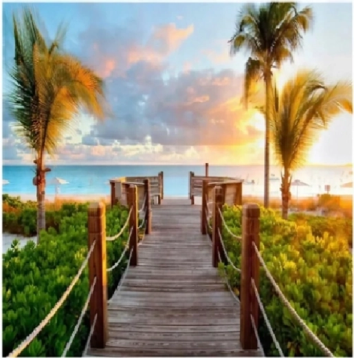 Ontdek ontspannend plezier voor iedereen met de creatieve set voor diamond painting Brug met palmen in het formaat 30 × 40 cm. In de verpakking vind je alles wat je nodig hebt – canvas met voorbedrukte afbeelding, applicatiepen, schaaltje, was en gekleurde steentjes. Het maken is eenvoudig, geen artistieke vaardigheid vereist, en het eindresultaat kan eenvoudig worden ingelijst en tentoongesteld.
