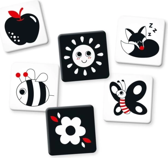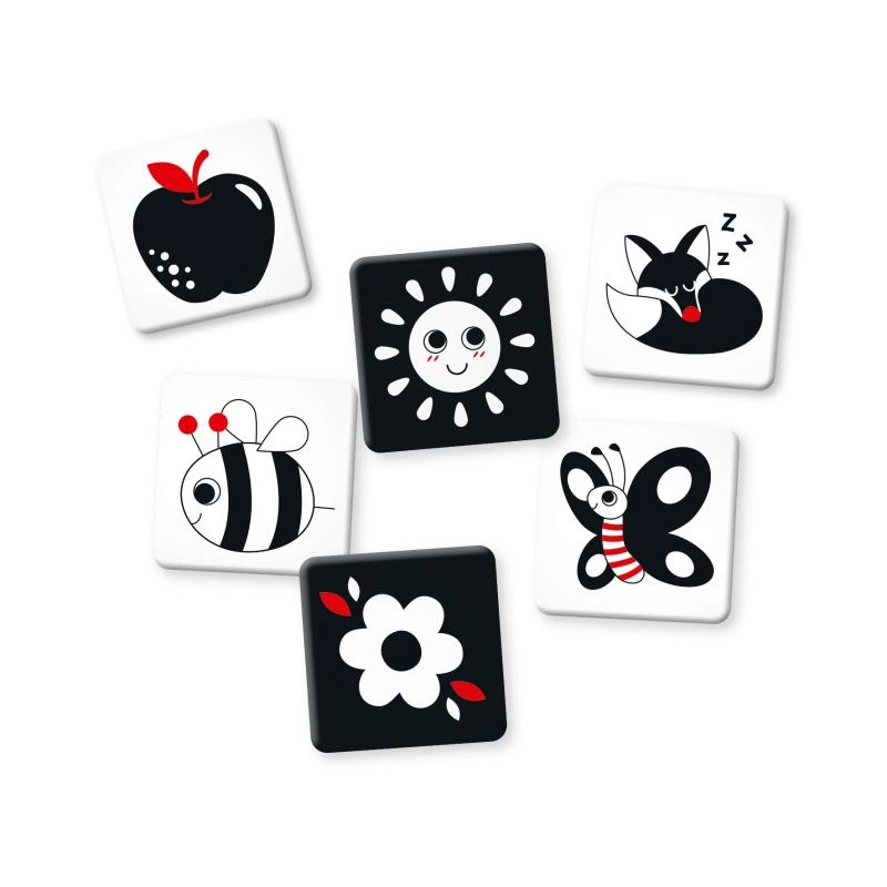 Dit eenvoudige leerspel is ideaal voor rustige momenten op een speelmat, in het ledikant, de kinderwagen of tijdens tummy time. Dankzij het contrast krijgt je kind sterke prikkels voor de vroege cognitieve ontwikkeling en leert het zich te concentreren op vorm, patroon en contour.
