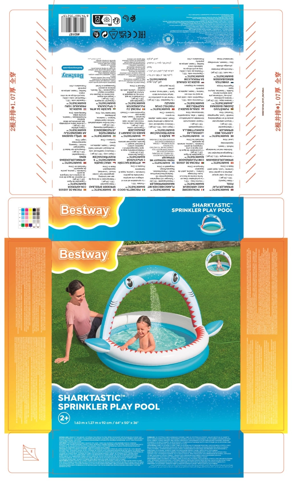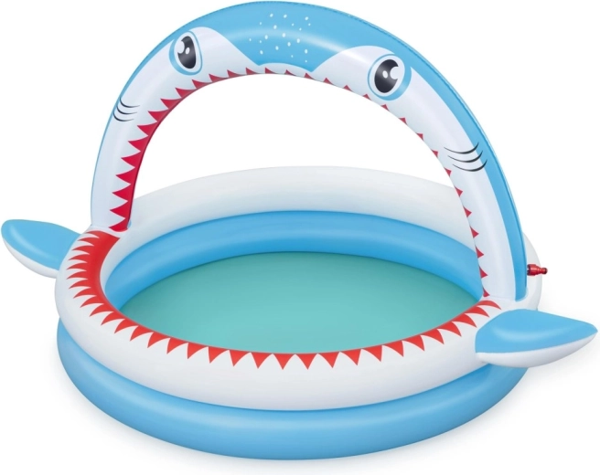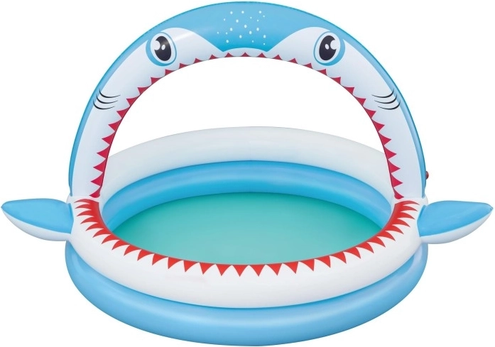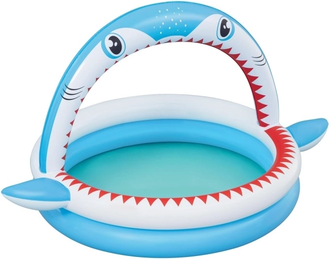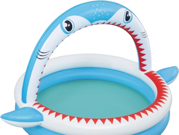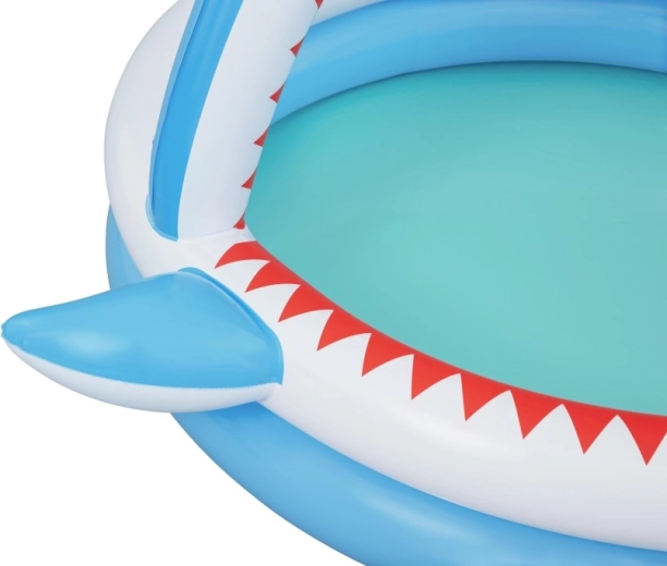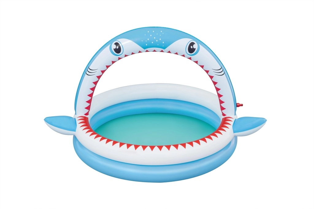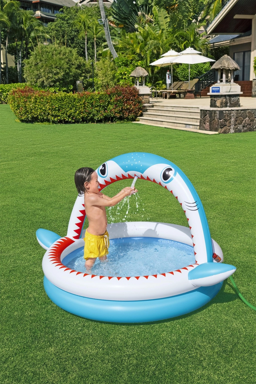 Leuk opblaasbaar zwembad in de vorm van een haai met een geïntegreerde sproeier voor verfrissing op hete dagen. Biedt royale afmetingen van 163 × 127 × 92 cm, zachte opblaasbare wanden en duurzaam PVC-materiaal. Ideaal voor kinderen vanaf 2 jaar, eenvoudig te opblazen, aan te sluiten op een tuinslang en in een mum van tijd klaar voor waterpret.