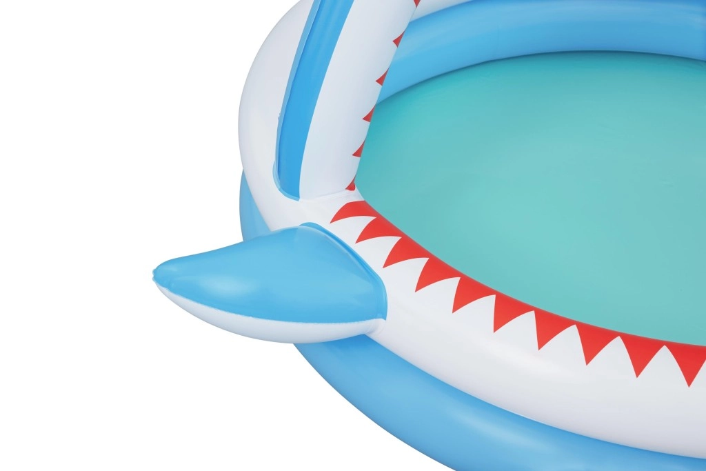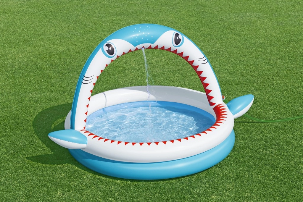 Maak van de zomer onvergetelijke pret met het kinderzwembad Sharktastic! Het vrolijke haaidesign met rode “tanden” en zijvinnen valt bij elke kleine zwemmer in de smaak. De boogvormige bek werkt als een sproeiboog – sluit gewoon een tuinslang aan en de zachte waterfontein zorgt voor aangename verkoeling.