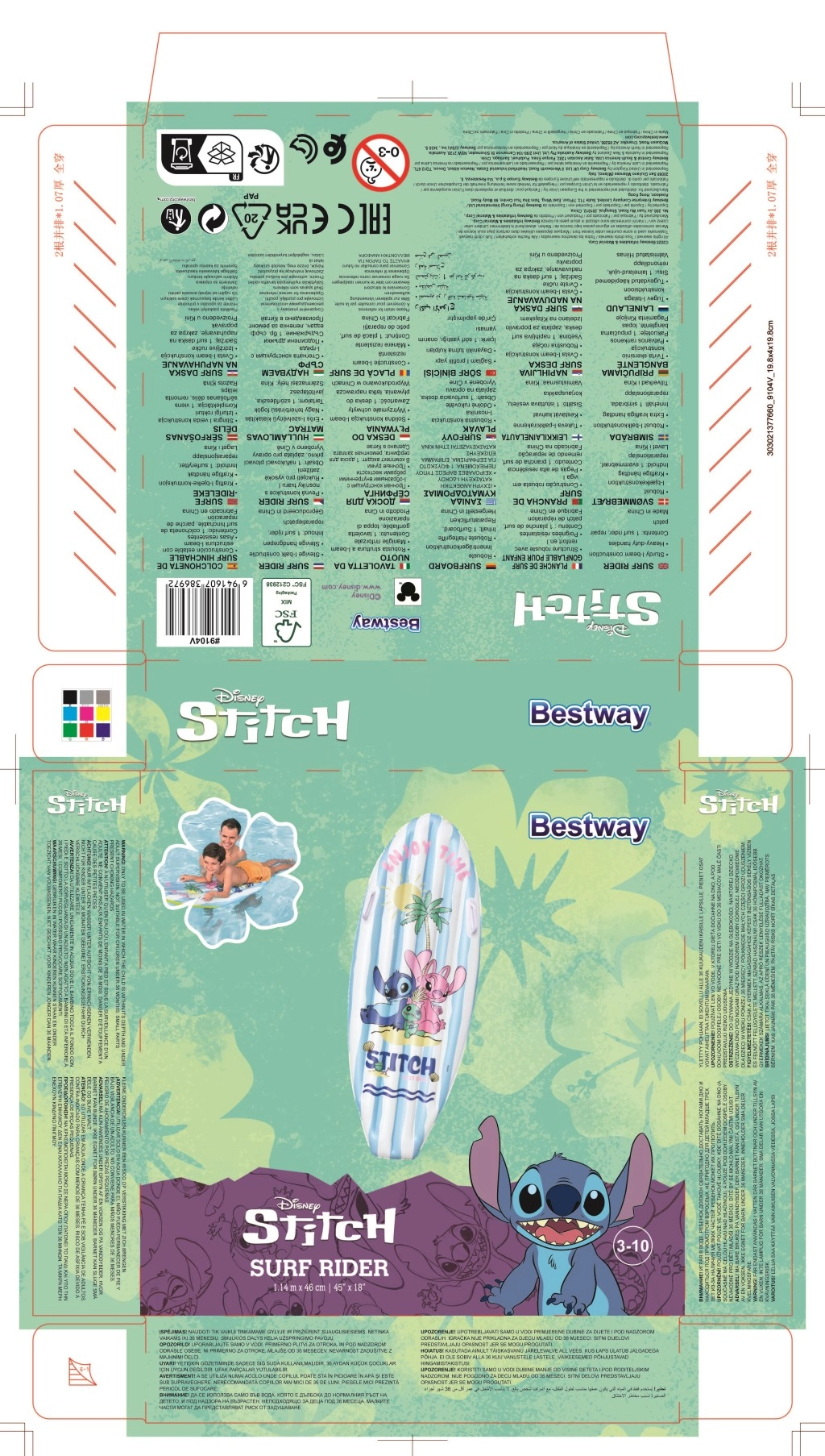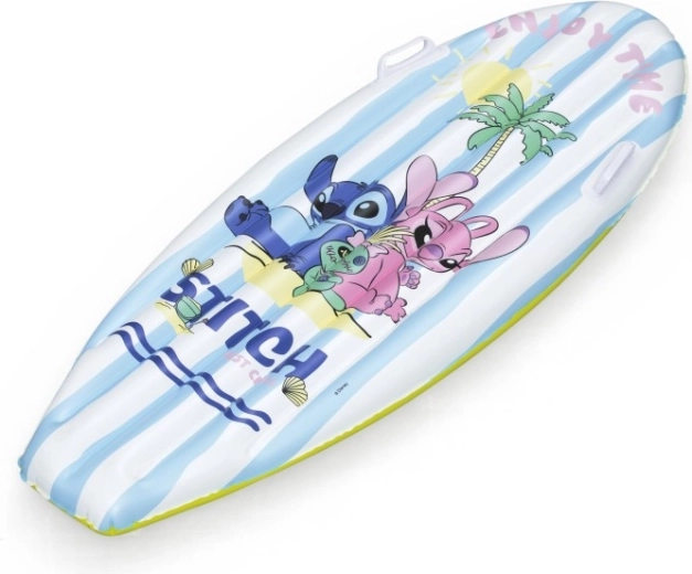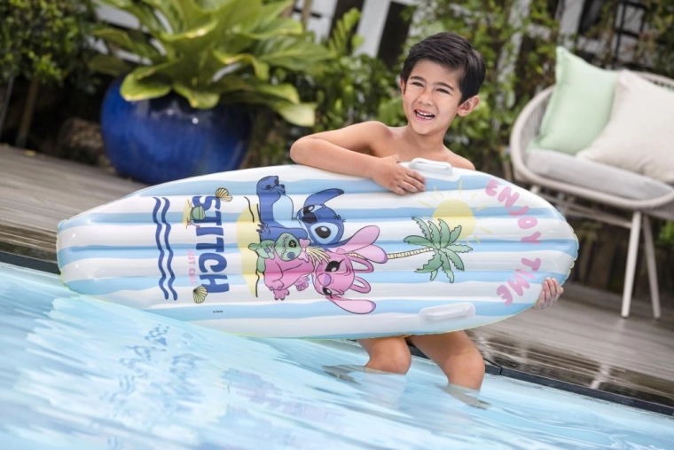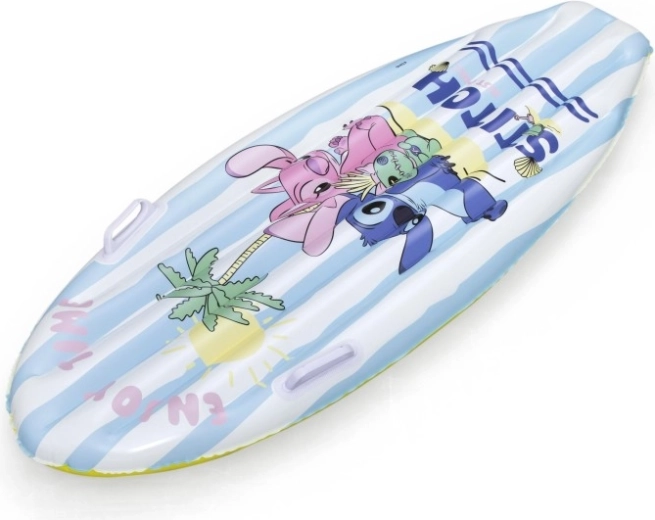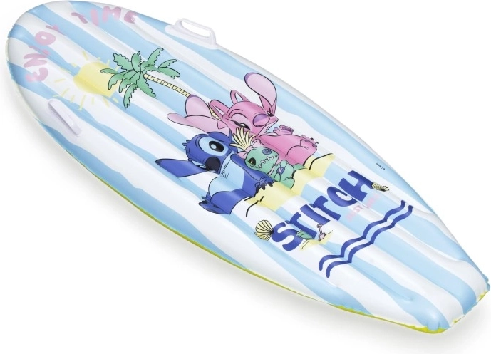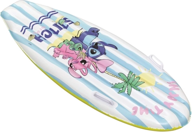 Het opblaasbare surfbord-vlot met DISNEY Stitch zal kinderen betoveren met vrolijke graphics met palmbomen, zon en schelpen. Blauw-witte strepen aan de bovenzijde en een gele onderkant verbeteren de zichtbaarheid op het water, terwijl het lage gewicht het dragen en hanteren vergemakkelijkt.