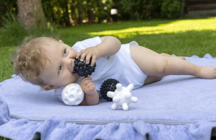 De set sensorische ballen met een diameter van circa 6,5 cm motiveert kinderen om te grijpen, te knijpen en verschillende texturen te verkennen. Het contrasterende zwart-witte design trekt op een natuurlijke manier de aandacht van baby’s en ondersteunt de ontwikkeling van het zicht en de oog-handcoördinatie.