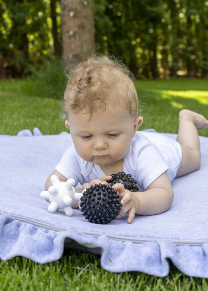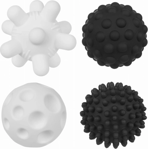 Ontdek een speelse set van vier sensorische ballen in een elegante zwart-witte combinatie voor de allerkleinsten. De verschillende oppervlakken stimuleren het lichaamsbewustzijn, de fijne motoriek en de grijpreflex, terwijl het zachte materiaal veilig voor kinderen is en prettig in de hand ligt.