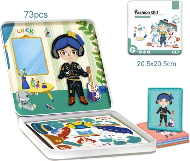 Deze stijlvolle set biedt kinderen eindeloze combinaties om aan te kleden en te mixen. Met 62 stukjes kunnen ze hun eigen modieuze creaties maken, zich laten inspireren door voorbeeldkaarten en met de meegeleverde whiteboardstift accessoires of details van de outfit verfijnen. De duurzame metalen doos is praktisch om op te bergen en mee te nemen, waardoor de puzzel zowel thuis, op uitstapjes als op vakantie perfect van pas komt.