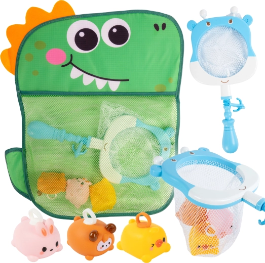 Geniet van badplezier met een waterspeelset met een hengel, schepnet, ruime tas met krokodillenmotief en schattige diertjes met een ring voor gemakkelijk vangen. Een uitstekende keuze voor de ontwikkeling van fijne motoriek en hand-oogcoördinatie tijdens het badderen.