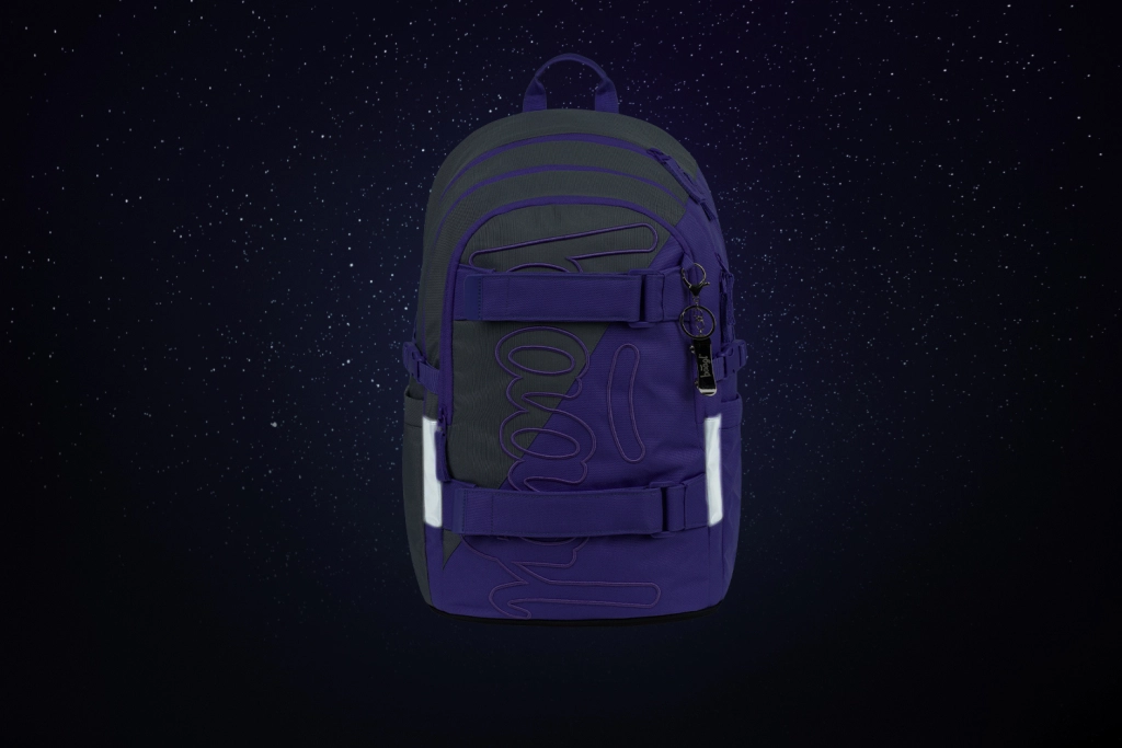 Waterafstotend materiaal met GRS-certificering, hoogwaardige YKK-ritsen en reflecterende elementen voor zichtbaarheid. Voorste banden bevestigen eenvoudig een skateboard.