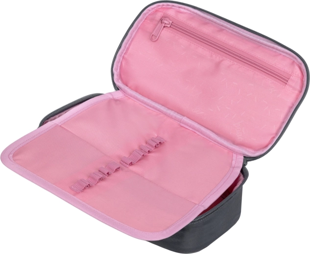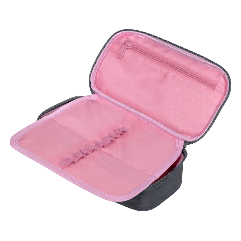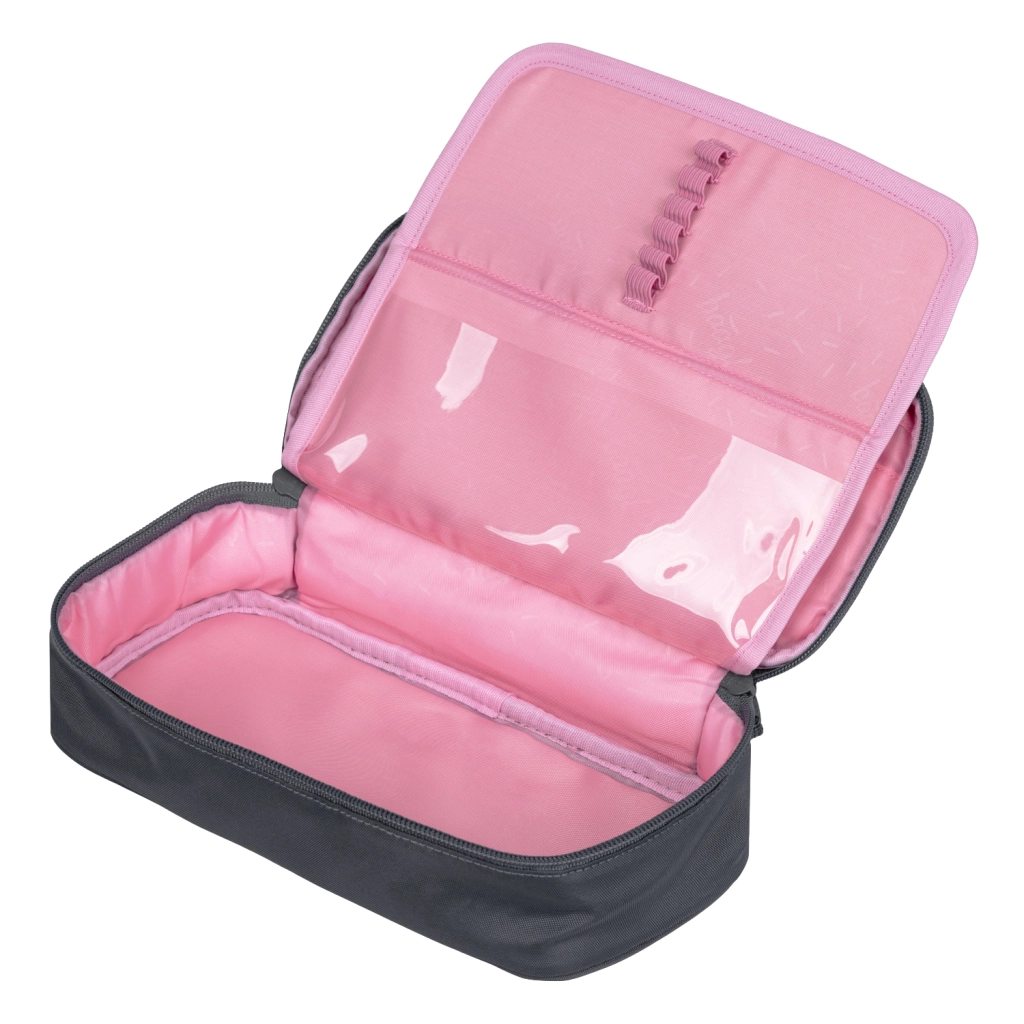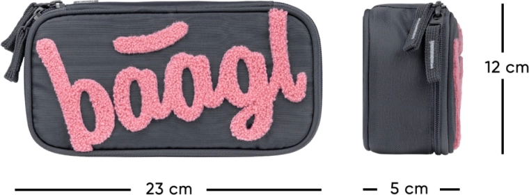 De praktische BAAGL-etui in elegant donkergrijs met roze logo combineert een moderne look met een slimme indeling. Het hoofdvak is ruim genoeg voor schrijfwaren en kleine accessoires, terwijl de dubbele uitklapflap met elastische lussen alles overzichtelijk op zijn plaats houdt. Er is ook een binnenvak en een transparant venster voor het lesrooster voor snelle oriëntatie tijdens de schooldag.