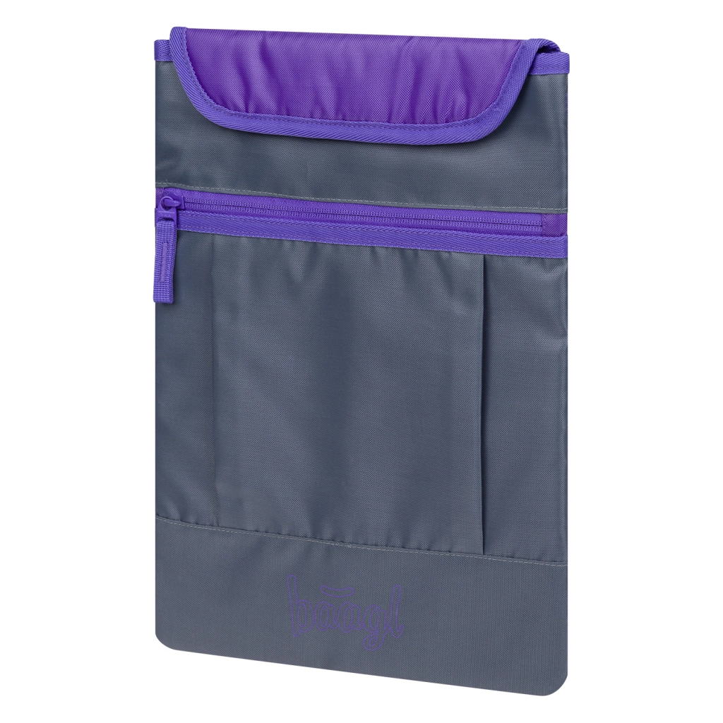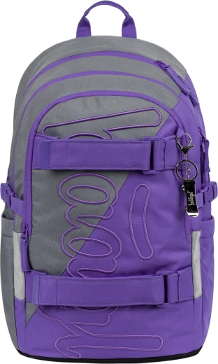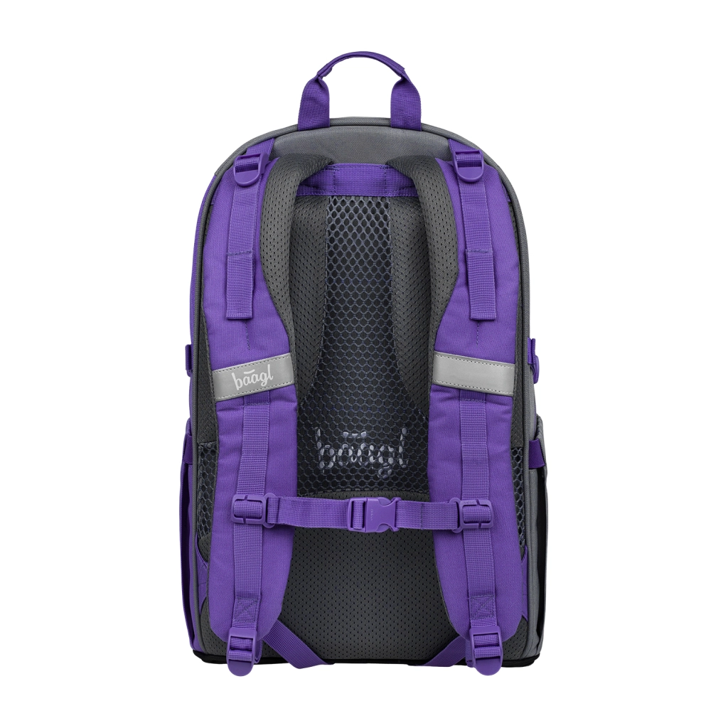 Complete schooluitrusting in het uniforme DUAL-design: ergonomische rugzak met drie vakken en organizer, opvouwbare sporttas voor trainingen of weekendtripjes, heuptasje voor het veilig meenemen van kleinigheden en dubbel etui met overzichtelijke indeling. De hele set is op elkaar afgestemd in moderne paars-grijze tinten en gemaakt van gerecyclede, waterafstotende materialen met focus op een lange levensduur.
