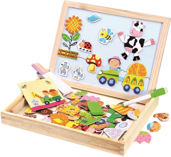 Al deze creatieve hulpmiddelen en stukken zijn opgeborgen in een houten doosje dat gemakkelijk te vervoeren is. Kinderen zullen urenlang plezier beleven met dit bord met boerderijthema en tegelijkertijd hun verbeelding en vaardigheden ontwikkelen.